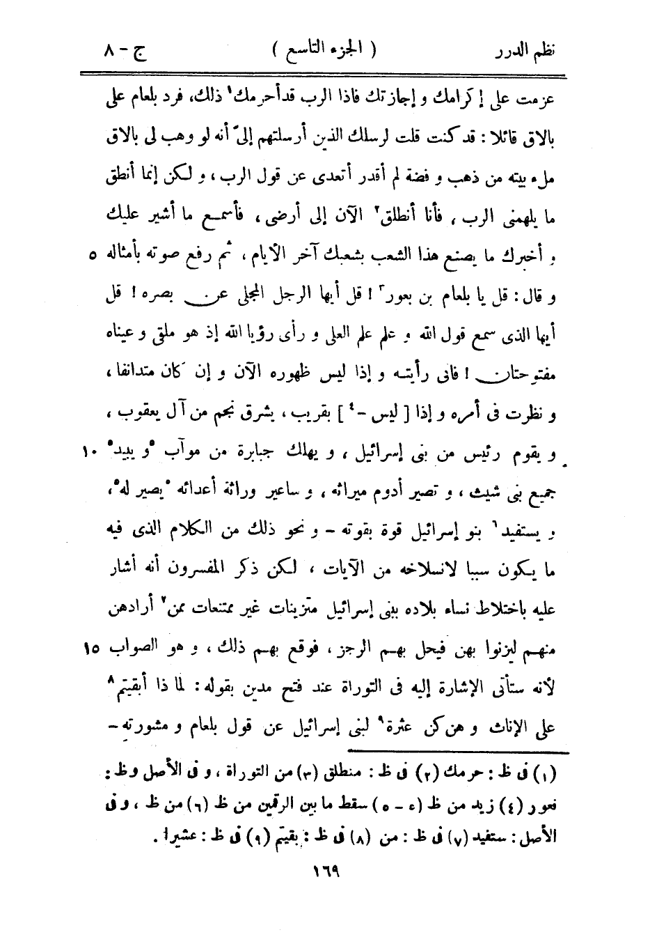 عزمت على إكرامك وإجازتك فإذا الرب قد أحرمك ذلك، فرد بلعام على بالاق قائلاً: قد كنت قلت لرسلك الذين أرسلتهم إليّ أنه لو وهب لي بالاق ملء بيته من ذهب وفضة لم أقدر أتعدى عن قول الرب، ولكن إنما انطق ما يلهمني الرب، فأنا أنطلق الآن إلى أرضي، فأسمع ما أشير عليك وأخبرك ما يصنع هذا الشعب بشعبك آخر الأيام، ثم رفع صوته بأمثاله وقال: قل يا بلعام بن بعور قل أيها الرجل المجلى عن بصره! قل أيها الذي سمع قول الله وعلم علم العلي ورأى رؤيا الله إذ هو ملقى وعيناه مفتوحتان! فإني رأيته وإذا ليس ظهوره الآن وإن كان متدانفاً، ونظرت في أمره وإذا ليس بقريب، يشرق نجم من آل يعقوب، ويقوم رئيس من بني إسرائيل، ويهلك جبابرة من مؤاب ويبيد جميع بني شيث، وتثير أدوم ميراثه، وساعير وراثة أعدائه يصير له، ويستفيد بنو إسرائيل قوة بقوته - ونحو ذلك من الكلام الذي فيه ما يكون سبباً لا نسلاخه من الآيات، لكن ذكر المفسرون أنه أشار عليه باختلاط نساء بلاده ببني إسرائيل متزينات غير ممتنعات ممن أرادهن منهم ليزنوا بهن فيحل بهم الرجز، فوقع بهم ذلك، وهو الصواب لأنه ستأتي الإشارة إليه في التوارة عند فتح مدين بقوله: لماذا أبقيتم على الإثاث وهن كن عثرة لبني إسرائيل عن قول بلعام ومشورته -