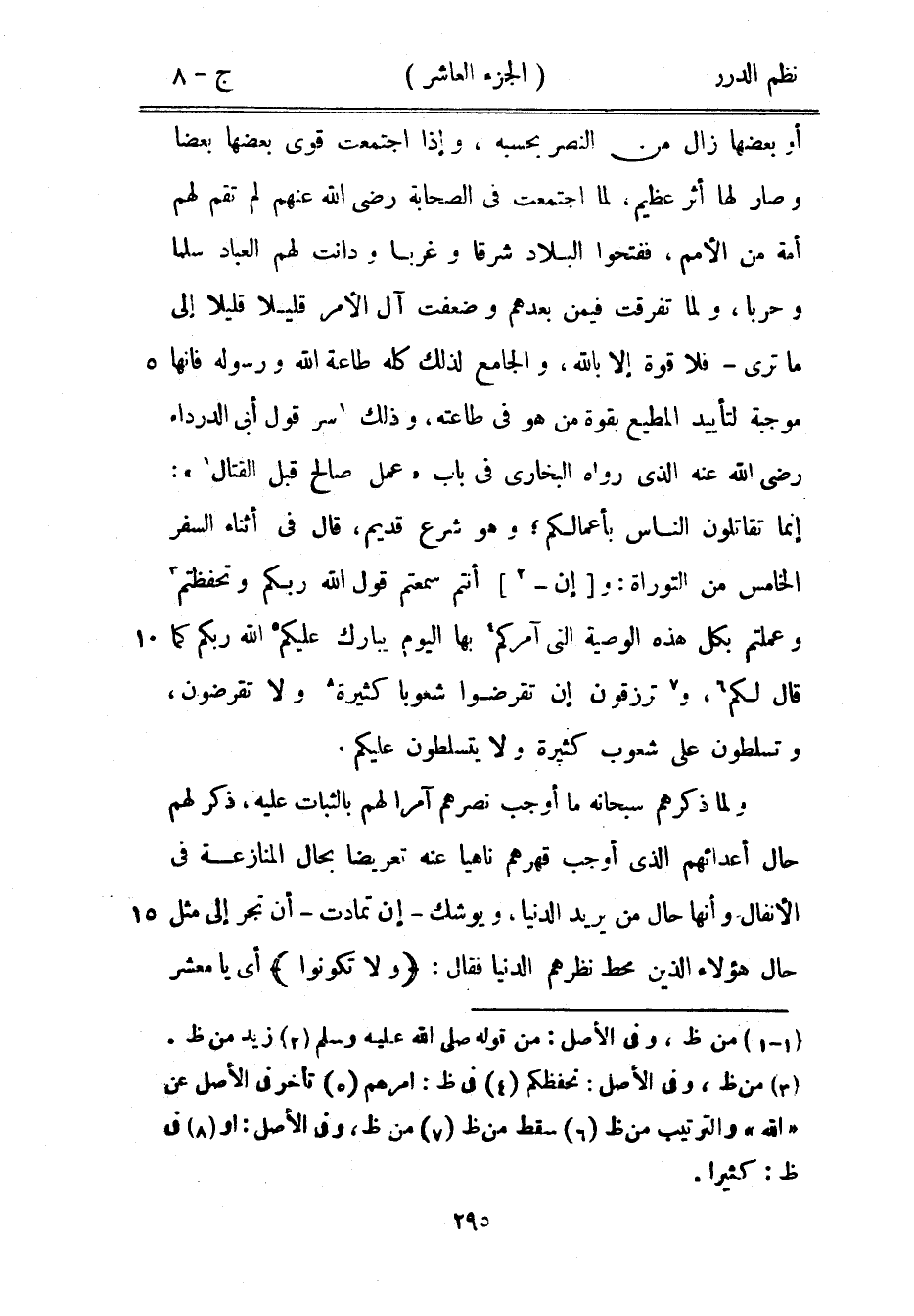 أو بعضها زال من النصر بحسبه، وإذا اجمتعت قوى بعضها بعضاً وصار لها أثر عظيم، لما اجتمعت في الصحابة رضي الله عنهم لم تقم لهم أمة من الأمم، ففتحوا البلاد شرقاً وغرباً ودانت لهم العباد سلماً وحرباً، ولما تفرقت فيمن بعدهم وضعفت آل الأمر قليلاً قليلاً إلى ما ترى - فلا قوة إلا بالله، والجامع لذلك كله طاعة الله ورسوله فإنها موجبة لتأييد المطيع بقوة من هو في طاعته، وذلك سر قول أبي الدرداء رضي الله عنه الذي رواه البخاري في باب «عمل صالح قبل القتال» : إنما تقاتلون الناس بأعمالكم؛ وهو شرع قديم، قال في أثناء السفر الخامس من التوارة: وإن أنتم سمعتم قول الله ربكم وتحفظتم وعملتم بكل هذه الوصية التي آمركم بها اليوم يبارك عليكم الله ربكم كما قال لكم، وترزقون إن تقرضوا شعوباً كثيرة ولا تقرضون، وتسلطون على شعوب كثيرة ولا يتسلطون عليكم.