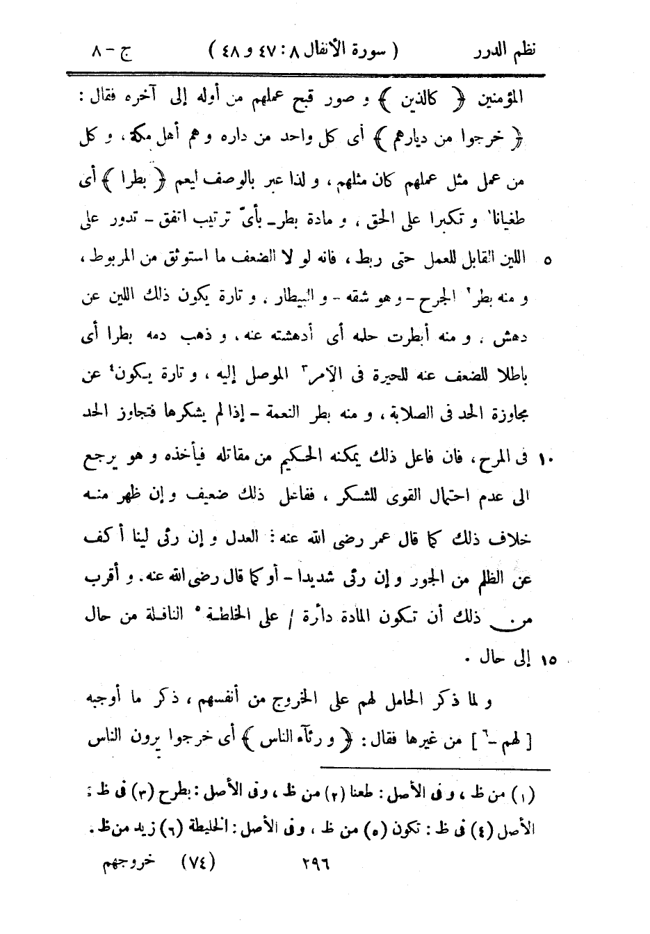 المؤمنين {كالذين} وصور قبح عملهم من أوله إلى آخره فقال: {خرجوا من ديارهم} أي كل واحد من داره وهم أهل مكة، وكل من عمل مثل عملهم كان مثلهم، ولذا عبر بالوصف ليعم {بطراً} أي طغياناً وتكبراً على الحق، ومادة بطر - بأيّ ترتيب اتفق - تدور على اللين القابل للعمل حتى ربط، فإنه لولا الضعف ما استوثق من المربوط، ومنه بطر الجرح - وهو شقه - والبيطار، وتارة يكون ذلك اللين عن دهش. ومنه أبطرت حلمه أي أدهشته عنه، وذهب دمه بطراً أي باطلاً للضعف عنه للحيرة في الأمر الموصل إليه، وتارة يكون عن مجاوزة الحد في الصلابة، ومنه بطر النعمة - إذا لم يشكرها فتجاوز الحد في المرح، فإن فاعل ذلك يمكنه الحكيم من مقاتله فيأخذه وهو يرجع إلى عدم احتمال القوى للشكر، ففاعل ذلك ضعيف وإن ظهر منه خلاف ذلك ما قال عمر رضي الله عنه: العدل وإن رئي ليناً أكف عن الظلم من الجور وإن رئي شديداً - أو كما قال رضي الله عنه. وأقرب من ذلك أن تكون المادة دائرة على الخلطة الناقلة من حال إلى حال.