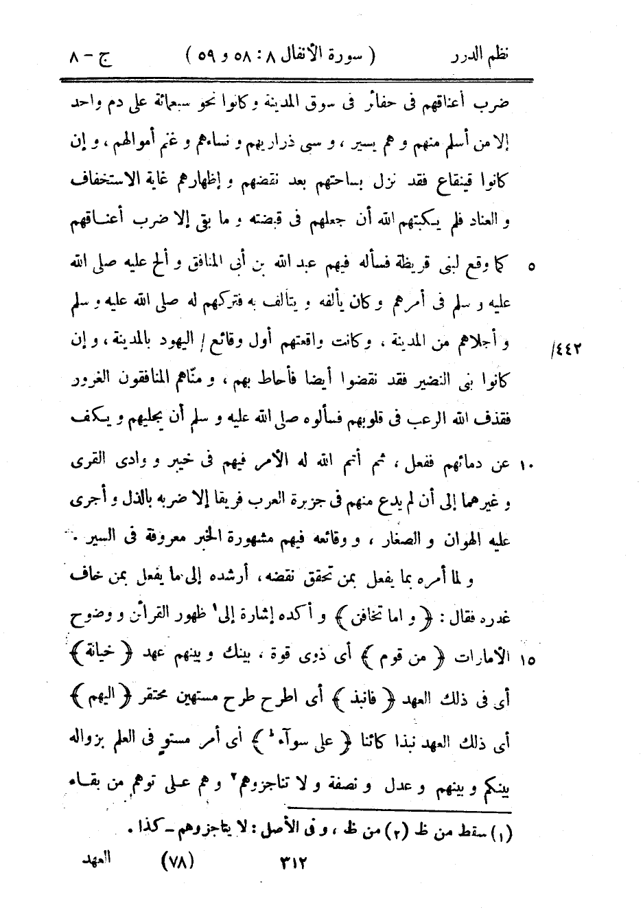 ضرب أعناقهم في حفائر في سوق المدينة وكانوا نحو سبعمائة على دم واحد. إلا من أسلم منهم وهم يسير، وسبى ذراريهم ونساءهم وغنم أموالهم، وإن كانوا قينقاع فقد نزل بساحتهم بعد نقضهم وإظهارهم غاية الاستخفاف والعناد فلم يكبتهم الله أن جعلهم في قبضته وما بقي إلا ضرب أعناقهم كما وقع لبني قريظة فسأله فيهم عبد الله بن أبي المنافق وألح عليه صَلَّى اللهُ عَلَيْهِ وَسَلَّمَ في أمرهم وكان يألفه ويتألف به فتركهم له صَلَّى اللهُ عَلَيْهِ وَسَلَّمَ وأجلاهم من المدينة، وكانت واقعتهم أول وقائع اليهود بالمدينة، وإن كانوا بني النضير فقد نقضوا أيضاً فأحاط بهم، ومنّاهم المنافقون الغرور فقذف الله الرعب في قلوبهم فسألوه صَلَّى اللهُ عَلَيْهِ وَسَلَّمَ أن يجليهم ويكف عن دمائهم ففعل، ثم أتم الله له الأمر فيهم في خيبر ووادي القرى وغيرهما إلى أن لم يدع منهم في جزيرة العرب فريقاً إلا ضربه بالذل وأجرى عليه الهوان والصغار، ووقائعه فيهم مشهورة الخبر معروفه في السير.
