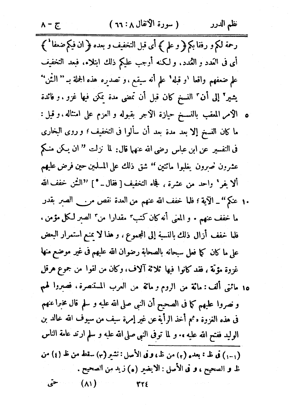 والمعنى أنه كان كتب مقدراً من الصبر لكل مؤمن، فلما خفف أزال ذلك بالنسبة إلى المجموع، وهذا لا يمنع استمرار البعض على ما كان كما فعل سبحانه بالصحابة رضوان الله عليهم في غير موضع منها غزوة مؤته، فقد كانوا فيها ثلاثة آلاف، وكان من لقوا من جموع هرقل مائتي ألف: مائة من الروم ومائة من العرب المستنصرة، فصبروا لهم ونصروا عليهم كما في الصحيح أن النبي صَلَّى اللهُ عَلَيْهِ وَسَلَّمَ قال مخبراً عنهم في هذه الغزوة «ثم أخذ الراية عن غير إمرة سيف من سيوف الله خالد بن الوليد ففتح الله عليه» ولما توفي النبي صَلَّى اللهُ عَلَيْهِ وَسَلَّمَ ارتد عامة الناس