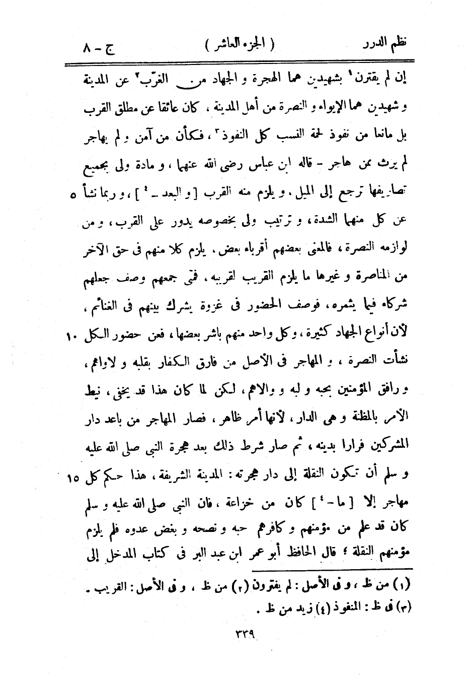 إن لم يقترن بشهيدين هما الهجرة والجهاد من الغرب عن المدينة وشهيدين هما الإيواء والنصرة من أهل المدينة، كان عائقاً عن مطلق القرب بل مانعاً من نفوذ لحمه النسب كل النفوذ، فكأن من آمن ولم يهاجر لم يرث ممن هاجر قاله ابن عباس رضي الله عنهما، ومادة ولي بجميع تصاريفها ترجع إلى الميل، ويلزم منه القرب والبعد، وربما نشأ عن كل منهما الشدة، وترتيب ولي بخصوصه يدور على القرب، ومن لوازمه النصرة، فالمعنى بعضهم أقرباء بعض، يلزم كلاً منهم في حق الآخر من المناصرة وغيره ما يلزم القريب لقريبه، فمتى جمعهم وصف جعلهم شركاء فيما يثمره، فوصف الحضور في غزوة يشرك بينهم في الغنائم، لأن أنواع الجهاد كثيرة، وكل واحد منهم باشر بعضها، فعن حضور الكل نشأت النصرة، والمهاجر في الأصل من فارق الكفار بقلبه ولاواهم، ورافق المؤمنين بحبه ولبه ووالاهم، لكن لما كان هذا قد يخفى، نيط الأمر بالمظنة وهي الدار، لأنها أمر ظاهر، فصار المهاجر من باعد دار المشركين فراراً بدينه، ثم صار شرط ذلك بعد هجرة النبي صَلَّى اللهُ عَلَيْهِ وَسَلَّمَ أن تكون النقلة إلى دار هجرته: المدينة الشريفة هذا حكم كل مهاجر إلا ما كان من خزاعة فإن النبي صَلَّى اللهُ عَلَيْهِ وَسَلَّمَ كان قد علم من مؤمنهم وكافرهم حبه ونصحه وبغض عدوه فلم يلزم مؤمنهم النقلة؛ قال الحافظ أبو عمر ابن عبد البر في كتاب المدخل إلى