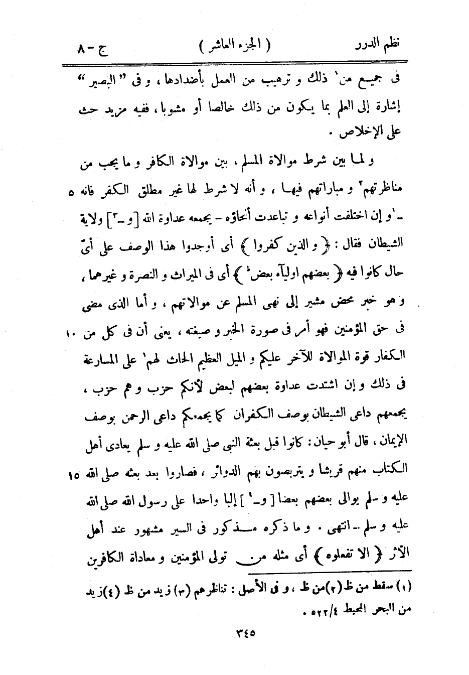 ولما بين شرط موالاة المسلم، بين مولاة الكافر وما يجب من مناظرتهم ومباراتهم فيها، وأنه لا شرط لها غير مطلق الكفر فإنه وإن اختلفت أنواعه وتباعدت أنحاؤه - يجمعه عداوة الله وولاية الشيطان فقال: {والذين كفروا} أي أوجدوا هذا الوصف على أي حال كانوا فيه {بعضهم أولياء بعض} أي في الميراث والنصرة وغيرهما، وهو خبر محض مشير إلى نهي المسلم عن موالاتهم، وأما الذي مضى في حق المؤمنين فهو أمر في صورة الخبر وصيغته، يعني أن في كل من الكفار قوة الموالاة للآخر عليكم والميل العظيم الحاث لهم على المسارعة في ذلك وإن اشتدت عداوة بعضهم لبعض لأنكم حزب وهم حزب، يجمعهم داعي الشيطان بوصف الكفران كما يجمعكم داعي الرحمن بوصف الإيمان، قال أبو حيان: كانوا قبل بعثة النبي صَلَّى اللهُ عَلَيْهِ وَسَلَّمَ يعادي أهل الكتاب منهم قريشاً ويتربصون بهم الدوائر، فصاروا بعد بعثه النبي صَلَّى اللهُ عَلَيْهِ وَسَلَّمَ يوالي بعضاً وإلباً واحداً على رسول الله صَلَّى اللهُ عَلَيْهِ وَسَلَّمَ انتهى. وما ذكره مذكور في السير مشهور عند أهل الأثر {إلا تفعلوه} أي مثله من تولي المؤمنين ومعاداة الكافرين