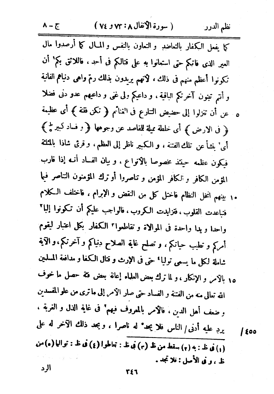 كما يفعل الكفار بالتعاضد والتعاون بالنفس والمال كما أرصدوا مال العير الذي فاتكم حتى استعانوا به على قتالكم في أحد، فاللائق بكم أن تكونوا أعظم منهم في ذلك، لأنهم يريدون بذلك رم واهي دنياهم الفانية وأنتم تبنون آخرتكم الباقية، وداعيكم ولي غنى وداعيهم عدو دنى فضلاً عن أن تنزلوا إلى حضيض التنازع في الغنائم {تكن فتنة} أي عظيمة {في الأرض} اي خلطة مميلة للمقاصد عن وجوهها {وفساد كبير*} أي ينشأ عن تلك الفتنة، والكبير ناظر إلى العظم، وقرىء شاذاً بالمثلثة فيكون عظمة حينئذ مخصوصاً بالأنواع، وبيان الفساد أنه إذا قارب المؤمن الكافر والكافر المؤمن وتناصروا أو ترك المؤمنون التناصر فيما بينهم انخّل النظام فاختل كل من النقض والإبرام، فاختلف الكلام فتباعدت القلوب، فتزايدت الكروب، فالواجب عليكم أن تكونوا إلباً واحداً ويداً واحدة في الموالاة وتقاطعوا الكفار بكل اعتبار ليقوم أمركم وتطيب حياتكم، وتصلح غاية الصلاح دنياكم وآخرتكم، والآية شاملة لكل ما يسمى تولياً حتى في الإرث وقتال الكفار ومدافعة المسلمين بالأمر والإنكار، ولما ترك بعض العلماء إعانة بعض فئة حصل ما خوف الله تعالى منه من الفتنة والفساد حتى صار الأمر إلى ما ترى من علو المفسدين وضعف أهل الدين، فالأمر بالمعروف فيهم في غاية الذل والغربة، يرد عليه أدنى الناس فلا يجد له ناصراً، ويجد ذلك الآخر له على