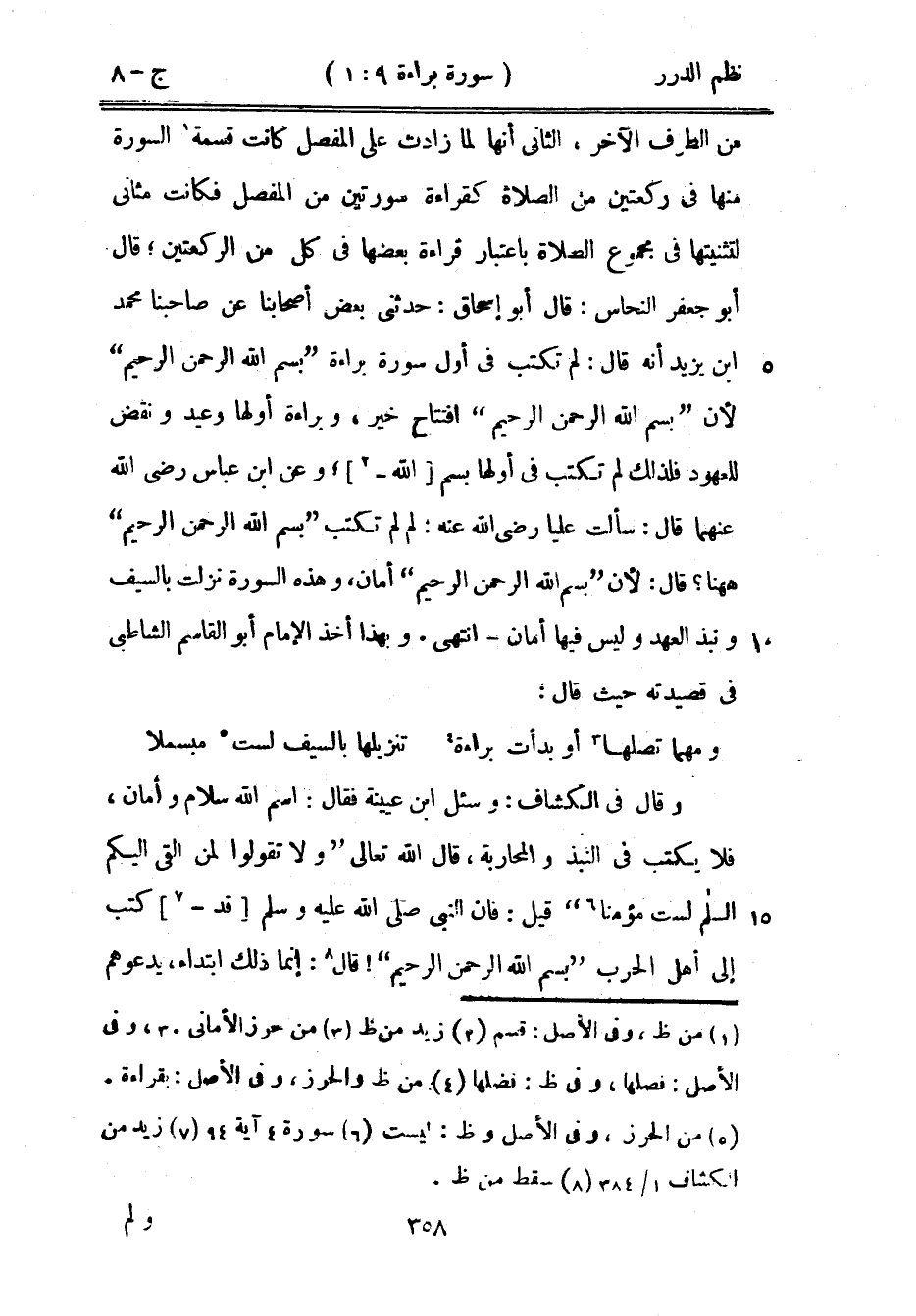 من الطرف الآخر، الثاني أنها لما زادت على المفصل كانت قسمة السورة منها في ركعتين من الصلاة كقراءة سورتين من المفصل فكانت مثاني لتثنيتها في مجموع الصلاة باعتبار قراءة بعضها في كل من الركعتين، قال أبو جعفر النحاس: قال أبو إسحاق: جدثني بعض أصحابنا عن صاحبنا محمد بن يزيد أنه قال: لم تكتب في أولها بسم الله، وعن ابن عباس رضي الله عنهما قال: سألت عليا رضي الله عنه: لم تكتب " بسم الله الرحمن الرحيم " ها هنا؟ قال: لأن بسم الله الرحمن الرحيم " أمان - انتهى. وبهذا أخذ الإمام أبو القاسم الشاطبي في قصيدته حيث قال: