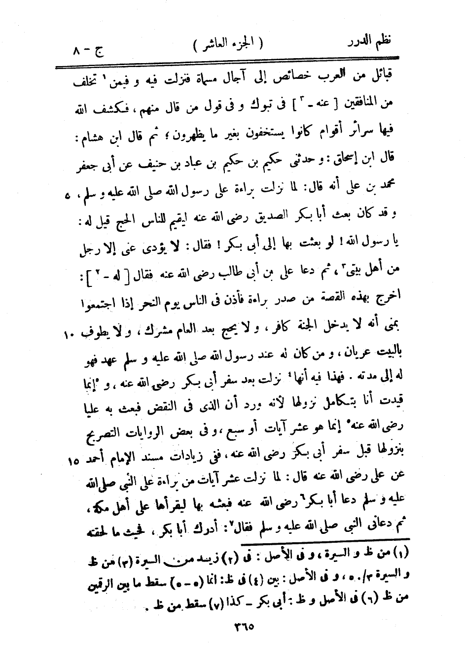 قبائل من العرب خصائص إلى آجال مسماة فنزلت فيه وفيمن تخلف من المنافقين عنه في تبوك وفي قول من قال منهم، فكشف الله فيها سرائر أقوام كانوا يستخفون بغير ما يظهرون؛ ثم قال ابن هشام: قال ابن إسحاق: وحدثني حكيم بن حكيم بن عباد بن حنيف عن أبي جعفر محمد بن علي أنه قال: «لما نزلت براءة على رسول الله صَلَّى اللهُ عَلَيْهِ وَسَلَّمَ، وقد كان بعث أبا بكر الصديق رضي الله عنه ليقيم للناس الحج قيل له: يارسول الله! لو بعثت بها إلى أبي بكر! فقال: لا يؤدي عني إلا رجل من أهل بيتي، ثم دعا علي بن أبي طالب رضي الله عنه فقال له: اخرج بهذه القصة من صدر براءة فأذن في الناس يوم النحر إذا اجتمعوا بمنى أنه لا يدخل الجنة كافر، ولا يجح بعد العام مشرك، ولا يطوف بالبيت عريان، ومن كان له عند رسول الله صَلَّى اللهُ عَلَيْهِ وَسَلَّمَ عهد فهو له إلى مدته»