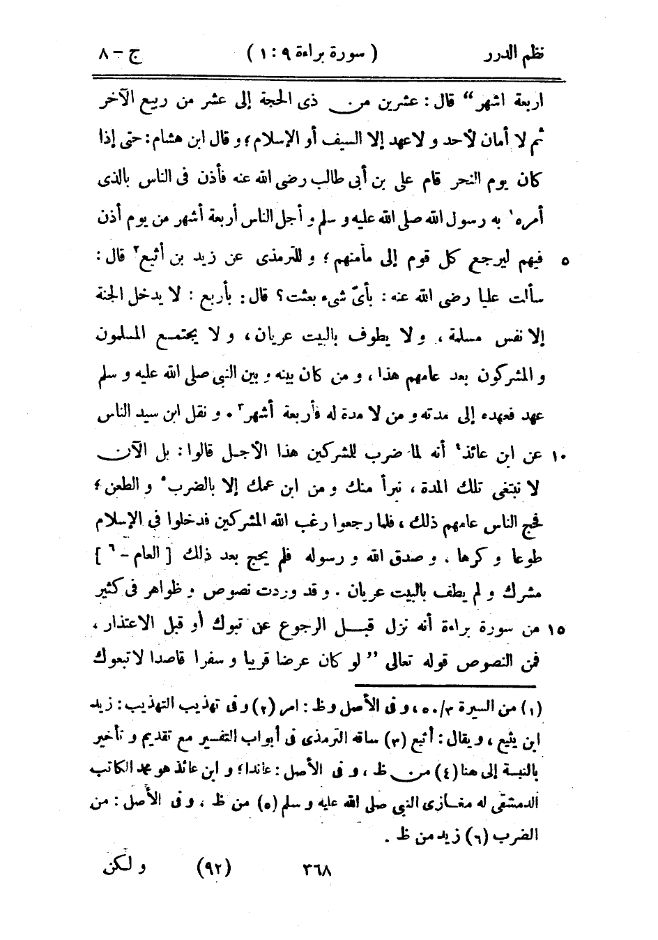 أربعة أشهر} قال: عشرين من ذي الحجة إلى عشر من ربيع الآخر ثم لا أمان لأحد ولا عهد إلى السيف أو الإسلام؛ وقال ابن هشام: حتى إذا كان يوم النحر قام علي بن أبي طالب رضي الله عنه فأذن في الناس بالذي أمره به رسول الله صَلَّى اللهُ عَلَيْهِ وَسَلَّمَ وأجل الناس أربعة اشهر من يوم أذن فيهم ليرجع كل قوم إلى مأمنهم؛ وللترمذي عن زيد بن أثيع قال: سألت علياً رضي الله عنه: بأيّ شيء بعثت؟ قال: بأربع: لا يدخل الجنة إلا نفس مسلمة، ولا يطوف بالبيت عريان، ولا يجتمع المسلمون والمشركون بعد عامهم هذا، ومن كان بينه وبين النبي صَلَّى اللهُ عَلَيْهِ وَسَلَّمَ عهد فعهده إلى مدته ومن لا مدة له فأربعة أشهر. ونقل ابن سيد الناس عن ابن عائذ انه لما ضرب للمشركين هذا الأجل قالوا: بل الآن لا نبتغي تلك المدة، نبرأ منك ومن ابن عمك إلا بالضرب والطعن؛ فحج الناس عامهم ذلك، فلما رجعوا رغب الله المشركين فدخلوا في الإسلام طوعاً وكرهاً. وصدق الله ورسوله فلم يحج بعد ذلك العام مشرك ولم يطف بالبيت عريان. وقد وردت نصوص وظواهر في كثير من سورة براءة أنه نزل قبل الرجوع عن تبوك أو قبل الاعتذار، فمن النصوص قوله تعالى {لو كان عرضاً قريباً وسفراً قاصداً لاتبعوك