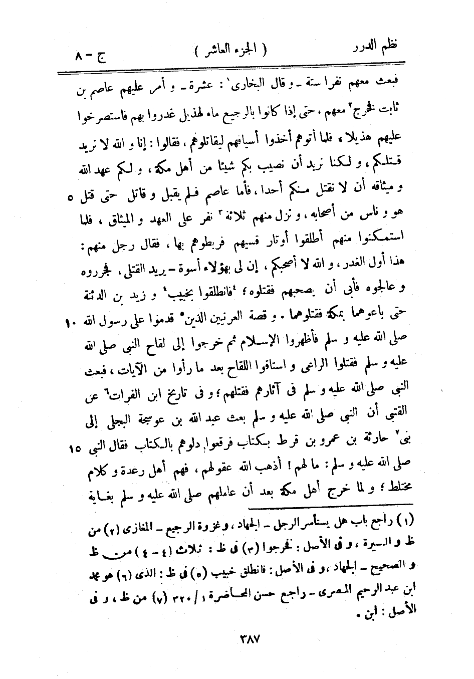 فبعث معهم نفراً ستة - وقال البخاري: عشرة - وأمر عليهم عاصم بن ثابت فخرج معهم، حتى إذا كانوا بالرجيع ماء لهذيل غدروا بهم فاستصرخوا عليهم هذيلاً، فلما أتوهم أخذوا أسيافهم ليقاتلوهم، فقالوا: إنا والله لا نريد قتلكم، ولكنا نريد أن نصيب بكم شيئاً من أهل مكة، ولكن عهد الله وميثاقه أن لا نقتل منكم أحداً، فأما عاصم فلم يقبل وقاتل حتى قتل هو ناس من أصحابه، ونزل منهم ثلاثة نفر على العهد والميثاق، فلما استمكنوا منهم أطلقوا أوتار قسيهم فربطوهم بها، فقال رجل منهم: هذا أول الغدر، والله لا أصحبكم، إن لي بهؤلاء أسوة - يريد القتلى، فجرروه وعالجوه فأبى أن يصحبهم فقتلوه؛ فانطلقوا بخبيب وزيد بن الدثنة حتى باعوهما بمكة فقتلوهما.