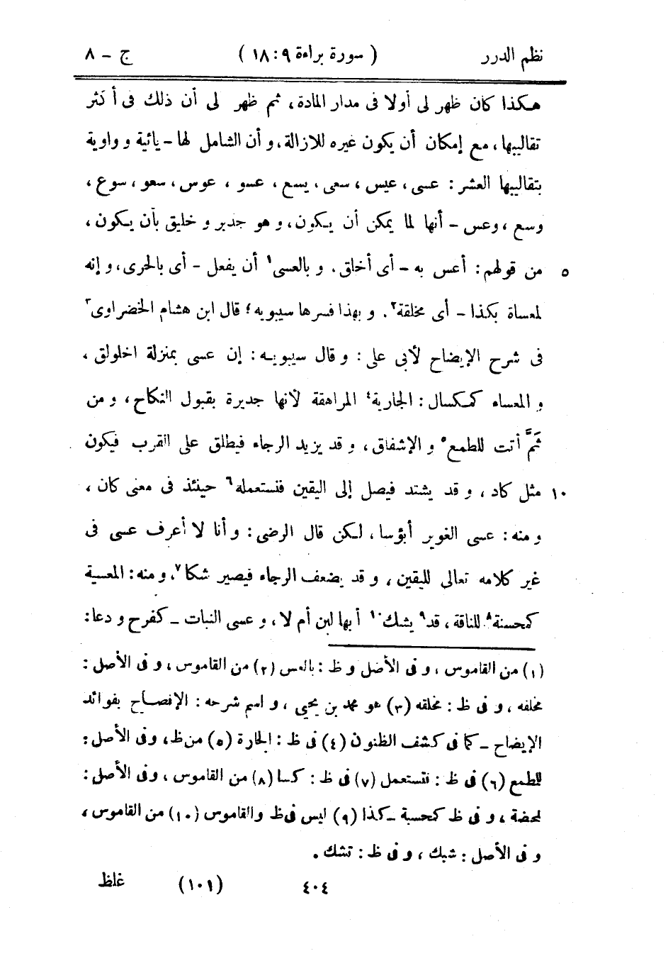 هكذا كان ظهر لي أولاً في مدار المادة، ثم ظهر لي أن ذلك في أكثر تقاليبها، مع إمكان أن يكون غيره للإزالة، وأن الشامل لها - يائية وواوية بتقاليبها العشر: عسى، عيس، سعى يسع، عسو، عوس، سعو، سوع، وسع، وعس - أنها لما يمكن أن يكون، وهو جدير وخليق بأن يكون، من قولهم: أعس به - أي أخلق.