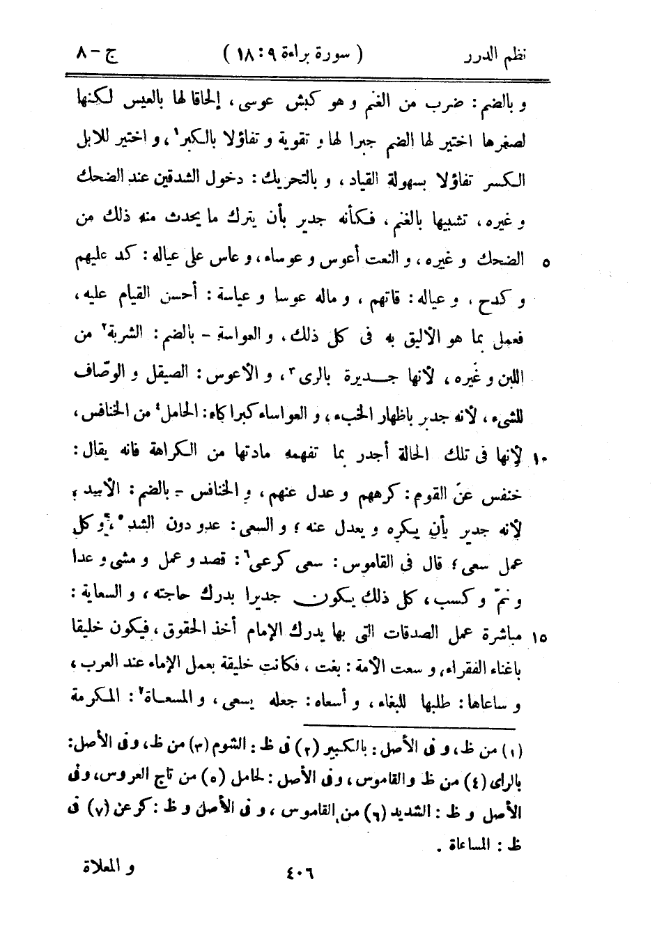 وبالضم: ضرب من الغنم وهو كبش عوسي، إلحاقاً لها بالعيس لكنها لصغرها اختير لها الضم جبراً لها وتقوية وتفاؤلاً بالكبر، واختير للإبل الكسر تفاؤلاً بسهولة القياد، وبالتحريك: دخول الشدقين عند الضحك وغيره: تشبيهاً بالغنم، فكأنه جدير بأن يترك ما يحدث منه ذلك من الضحك وغيره، والنعت أعوس وعوساء، وعاس على عياله: كد عليهم وكدح، وعياله: قاتهم، وماله عوساً وعياسة: أحسن القيام عليه فعمل بما هو الأليق به في كل ذلك والعواسة - بالضم: الشربة من اللبن وغيره، لأنها جديرة بالري، والأعوس: الصقيل والوصّاف للشيء، لأنه جدير بإظهار الخبء، والعوساء كبراكاء: الحامل من الخنافس، لأنها في تلك الحالة أجدر بما تفهمه مادتها من الكراهة فإنه يقال: خنفس عن القوم: كرههم وعدل عنهم، والخنافس - بالضم: الأسد، لأنه جدير بأن يكره ويعدل عنه؛ والسعي: عدو دون الشد وكل عمل سعي؛ قال في القاموس: سعى كرعى: قصد وعلم ومشى وعدا ونمّ وكسب، وكل ذلك يكون جديراً بدرك حاجته، والسعاية: مباشرة عمل الصدقات التي بها يدرك الإمام أخذ الحقوق، فيكون خليقاً بإغناء الفقراء، وسعت الأمة: بغت، فكانت خليقة بعمل الإماء عند العرب، وساعاها: طلبها للبغاء، وأسعاه: جعله يسعى، والمسعاة: المكرمة
