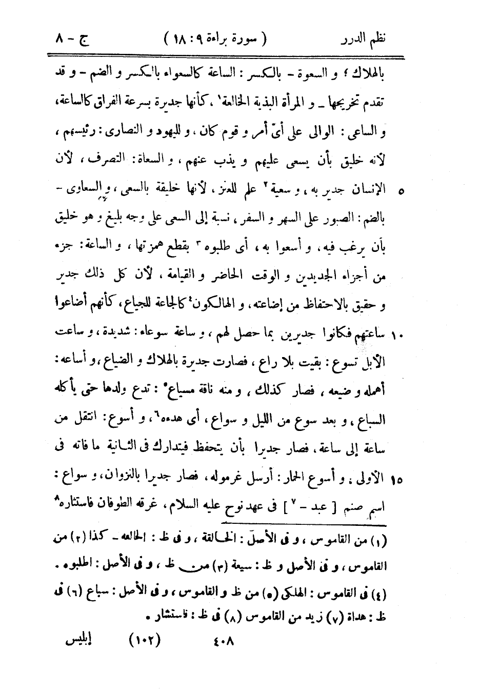 بالهلاك، والسعوة - بالكسر: الساعة كالسعواء بالكسر والضم - وقد تقدم تخريجها - والمرأة البذية الخالعة، كأنها جديرة بسرعة الفراق كالساعة، والساعي: الوالي على أي أمر وقوم كان، ولليهود والنصارى: رئيسهم، لأنه خليق بأن يسعى عليهم ويذب عنهم، والسعاة: التصرف، لأن الإنسان جدير به، وسعيه علم للعنز، لأنها خليقة بالسعي، والسعاوي - بالضم: الصبور على السهر والسفر، نسبة إلى السعي على وجه بليغ وهو خليق بأن يرغب فبه، وأسعوا به، أي طلبوه بقطع همزتها، والساعة: جزء من أجزاء الجديدين والوقت الحاضر والقيامة، لأن كل ذلك جدير وحقيق بالاحتفاظ من إضاعته، والهالكون كالجاعة للجياع، كأنهم أضاعوا ساعتهم فكانوا جديرين بما حصل لهم، وساعة سوعاء: شديدة، وساعت الإبل تسوع: بقيت بلا راع، فصارت جديرة بالهلاك والضياع، وأساعه: أهمله وضيعه، فصار كذلك، ومنه ناقة مسياع: تدع ولدها حتى يأكله السباع، وبعد سوع من الليل وسواع، أي هدوئه، وأسوع: انتقل من ساعة إلى ساعة فصار جديراً بأن يتحفظ فيتدارك في الثانية ما فاته في الأولى، وأسوع الحمار: أرسل غرموله، فصار جديراً بالنزوان، وسواع: اسم صنم عبد في عهد نوح عليه السلام، غرقه الطوفان فاستثاره