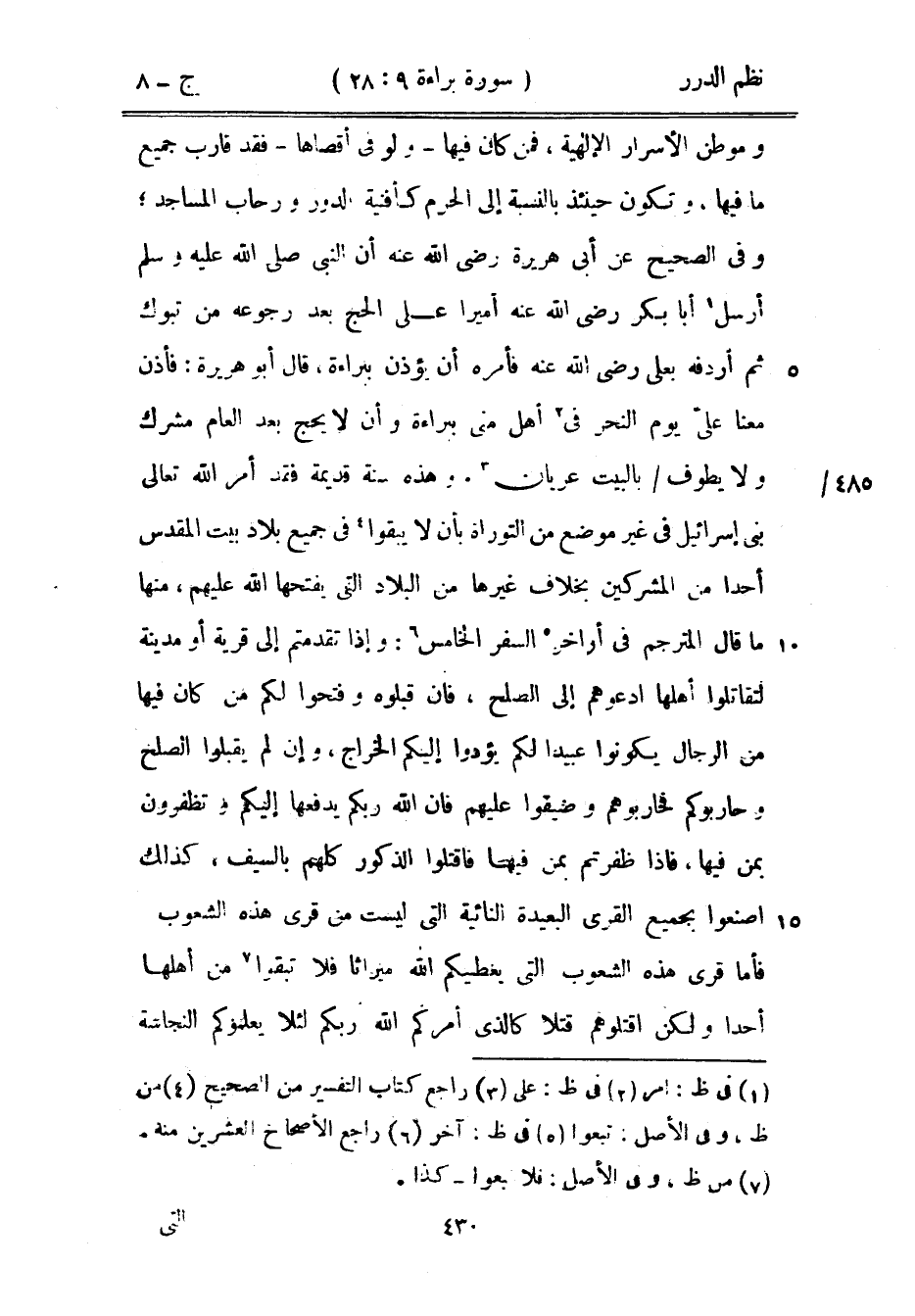وموطن الأسرار الإلهية، فمن كان فيها - ولو في أقصاها - فقد قارب جميع ما فيها، وتكون حينئذ بالنسبة إلى الحرم كأفنية الدور ورحاب المساجد؛ وفي الصحيح عن أبي هريرة رضي الله عنه أن النبي صَلَّى اللهُ عَلَيْهِ وَسَلَّمَ أرسل أبا بكر رضي الله عنه أميراً على الحج بعد رجوعه من تبوك ثم أردفه بعلي رضي الله عنه فأمره أن يؤذن ببراءة، قال أبو هريرة: فأذن معنا عليّ يوم النحر في أهل منى ببراءة وأن لا يحج بعد العام مشرك ولا يطوف بالبيت عريان. وهذه سنة قديمة فقد أمر الله تعالى بني إسرائيل في غير موضع من التوارة بأن لا يبقوا في جميع بلاد بيت المقدس أحداً من المشركين بخلاف غيرها من البلاد التي يفتحها الله عليهم، منها ما قال المترجم في أواخر السفر الخامس: وإذا تقدمتم إلى قرية أو مدينة لتقاتلوا أهلها ادعوهم إلى الصلح، فإن قبلوه وفتحوا لكم من كان فيها من الرجال يكونوا عبيداً لكم يؤدوا إليكم الخراج، وإن لم يقبلوا الصلح وحاربوكم فحاربوهم وضيقوا عليهم فإن الله ربكم يدفعها إليكم وتظفرون بمن فيها، فإذا ظفرتم بمن فيها فاقتلوا الذكور كلهم بالسيف، كذلك اصنعوا بجميع القرى البعيدة النائية التي ليست من قرى هذه الشعوب فأما قرى هذه الشعوب التي يعطيكم الله ميراثاً فلا تبقوا من أهلها احداً ولكن اقتلوهم قتلاً كالذي أمركم الله ربكم لئلا يعلموكم النجاسة