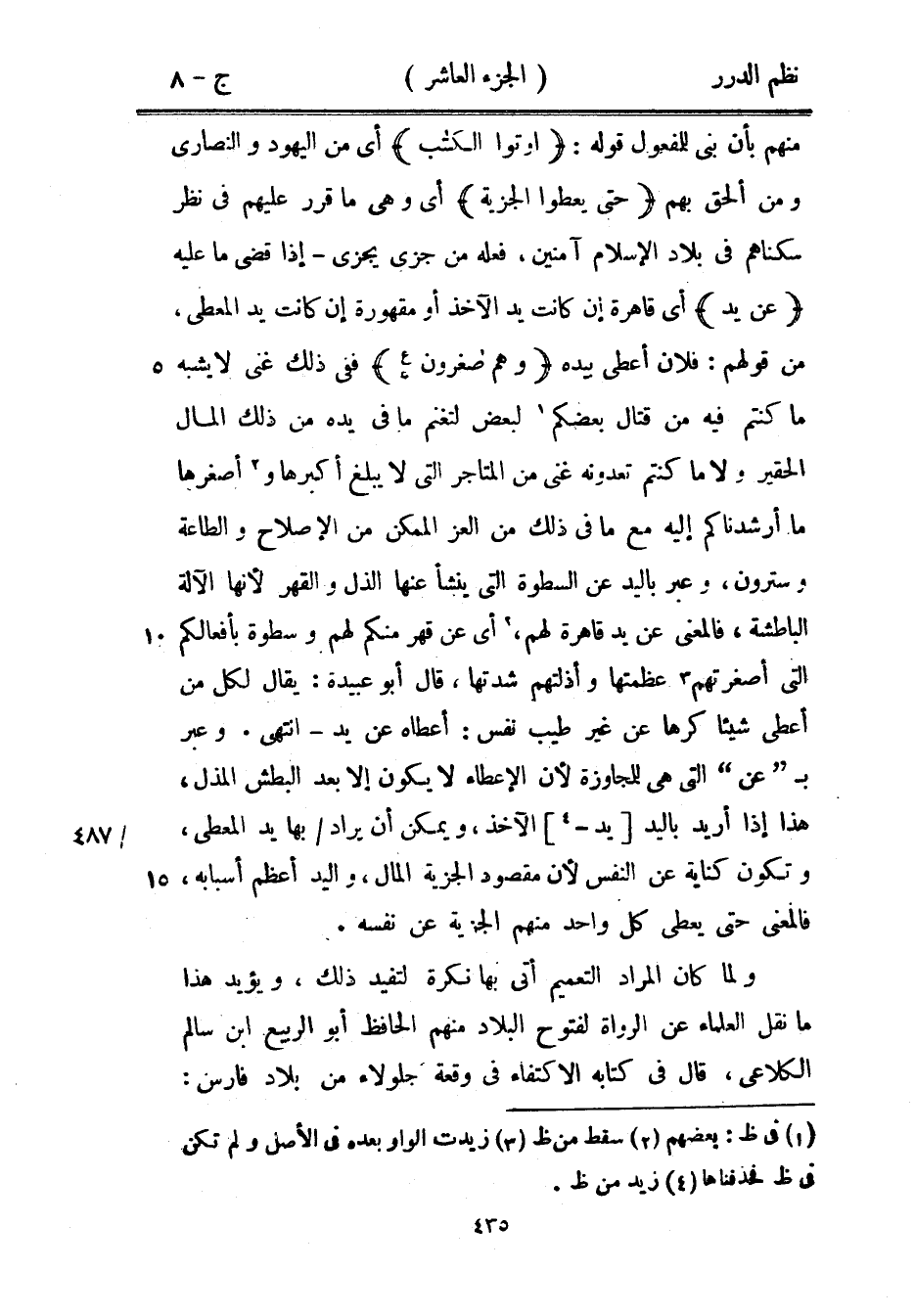 منهم بأن بني للمفعول قوله: {أوتوا الكتاب} أي من اليهود والنصاري ومن ألحق بهم {حتى يعطوا الجزية} أي وهي ما قرر عليهم في نظر سكناهم في بلاد الإسلام آمنين، فعله من جزى يجزي.