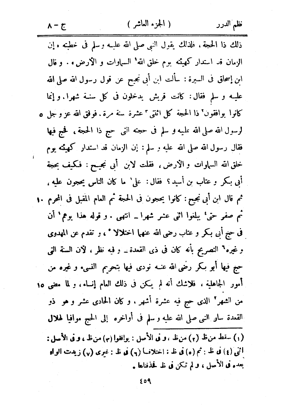 ذلك ذا الحجة، فلذلك يقول النبي صَلَّى اللهُ عَلَيْهِ وَسَلَّمَ في خطبته «إن الزمان قد استدار كهيئته يوم خلق الله السماوات والأرض» وقال ابن إسحاق في السيرة؛ سألت ابن أبي نجيح عن قول رسول الله صَلَّى اللهُ عَلَيْهِ وَسَلَّمَ فقال؛ كانت قريش يدخلون في كل سنة شهراً، وإنما كانوا يوافقون ذا الحجة كل اثنتي عشرة سنة مرة، فوفق الله عز وجل لرسول الله صَلَّى اللهُ عَلَيْهِ وَسَلَّمَ في حجته التي حج ذا الحجة، فحج فيها فقال رسول الله صَلَّى اللهُ عَلَيْهِ وَسَلَّمَ: «إن الزمان قد استدار كهيئته يوم خلق الله السموات والأرض» ، فقلت لابن أبي نجيح: فكيف بحجة أبي بكر وعتاب بن أسيد؟ فقال: على ما كان الناس يحجون عليه، ثم قال ابن أبي نجيح: كانوا يحجون في الحجة ثم العام المقبل في المحرم ثم صفر حتى يبلغوا اثنى عشر شهراً - انتهى.