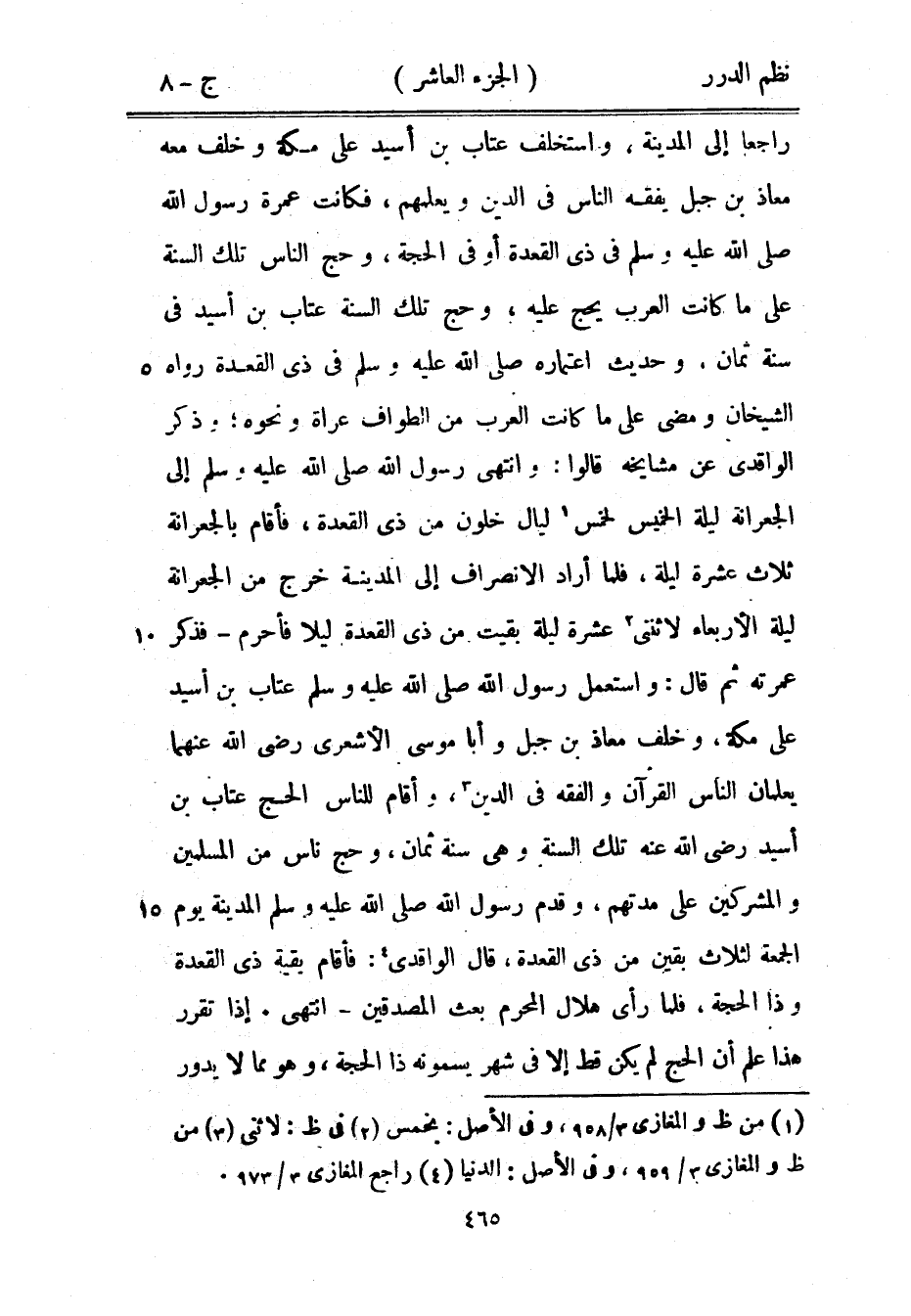 راجعاً إلى المدينة، واستخلف عتاب بن أسيد على مكة وخلف معه معاذ بن جبل يفقه الناس في الدين ويعلمهم، فكانت عمرة رسول الله صَلَّى اللهُ عَلَيْهِ وَسَلَّمَ في ذي القعدة أو في الحجة، وحج الناس تلك السنة على ما كانت العرب يحج عليه، وحج تلك السنة عتاب بن أسيد سنة ثمان، وحديث اعتماره صَلَّى اللهُ عَلَيْهِ وَسَلَّمَ في ذي العقدة رواه الشيخان ومضى على ما كانت العرب من الطواف عراة ونحوه؛ وذكره الواقدي عن مشايخ قالوا: وانتهى رسول الله صَلَّى اللهُ عَلَيْهِ وَسَلَّمَ إلى الجعرانة ليلة الخميس لخمس ليال خلون من ذي القعدة، فأقام بالجعرانة ثلاث عشرة ليلة، فلما أراد الانصراف إلى المدينة خرج من الجعرانة ليلة الأربعاء لاثنتي عشرة ليلة بقيت من ذي القعدة ليلاً فأحرم - فذكرعمرته ثم قال: واستعمل رسول الله صَلَّى اللهُ عَلَيْهِ وَسَلَّمَ عتاب بن أسيد على مكة، وخلف معاذ بن جبل وأبا موسى الأشعري رضي الله عنهما يعلمان الناس القرآن والفقه في الدين، وأقام للناس الحج عتاب بن أسيد رضي الله عنه عن تلك السنة وهي سنة ثمان، وحج ناس من المسلمين والمشركين على مدتهم، وقدم رسول الله صَلَّى اللهُ عَلَيْهِ وَسَلَّمَ المدينة يوم الجمعه لثلاث بقين من ذي القعدة، قال الواقدي: فأقام بقية ذي القعدة وذا الحجة، فلما رأى هلال المحرم بعث المصدقين - انتهى.