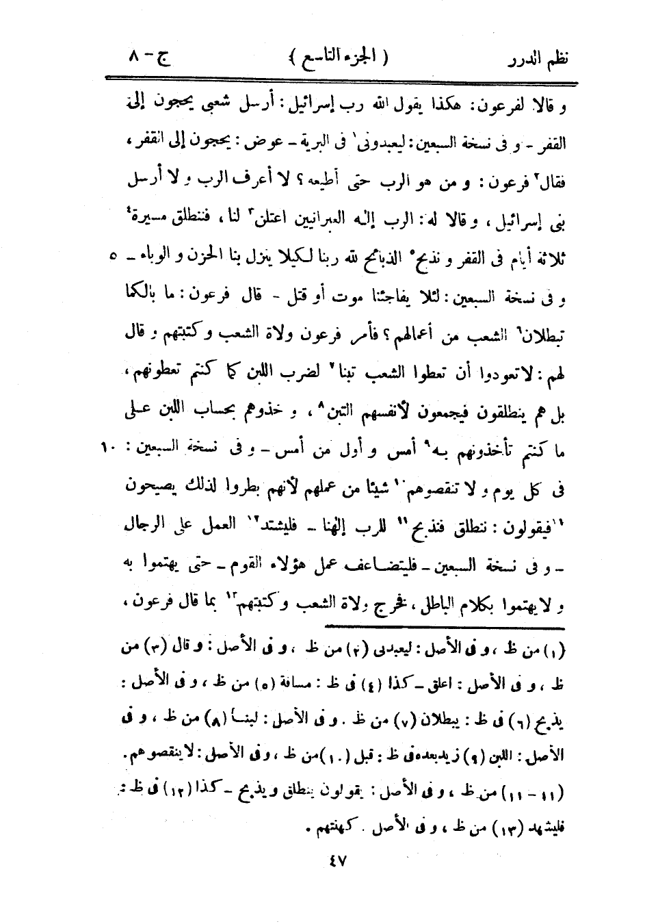 وقالا لفرعون: هكذا يقول الله رب إسرائيل: أرسل شعبي يحجون إلى القفر - وفي نسخة السبعين: ليعبدوني في البرية - عوض: يحجون إلى القفر، فقال فرعون: ومن هو الرب حتى أطيعه؟ لا أعرف الرب ولا أرسل بني إسرائيل، وقالا له: الرب إله العبرانيين اعتلن لنا، فننطلق مسيرة ثلاثة أيام القفر ونذبح الذبائح لله ربنا لكيلا ينزل بنا الحزن والوباء - وفي نسخة السبعين: لئلا يفاجئنا موت أو قتل - قال فرعون: ما بالكما تبطلان الشعب من أعمالهم؟ فأمر فرعون ولاة الشعب وكتبتهم وقال لهم: لا تعودوا أن تعطوا الشعب تبناً لضرب اللبن كما كنتم تعطونهم، بل هم ينطلقون فيجمعون لأنفسهم التبن، وخذوهم بحساب اللبن على ما كنتم تأخذونهم به أمس وأول من أمس - ونسخة السبعين: في كل يوم لا تنقصوهم شيئاً من عملهم لأنهم بطروا لذلك يصيحون فيقولون: ننطلق فنذبح للرب إلهنا - فليشتد العمل على الرجال - ونسخة السبعين - فليتضاعف عمل هؤلاء القوم - حتى يهتموا به ولا يهتموا بكلام الباطل، فخرج ولاة الشعب وكتبتهم يما قال فرعون،