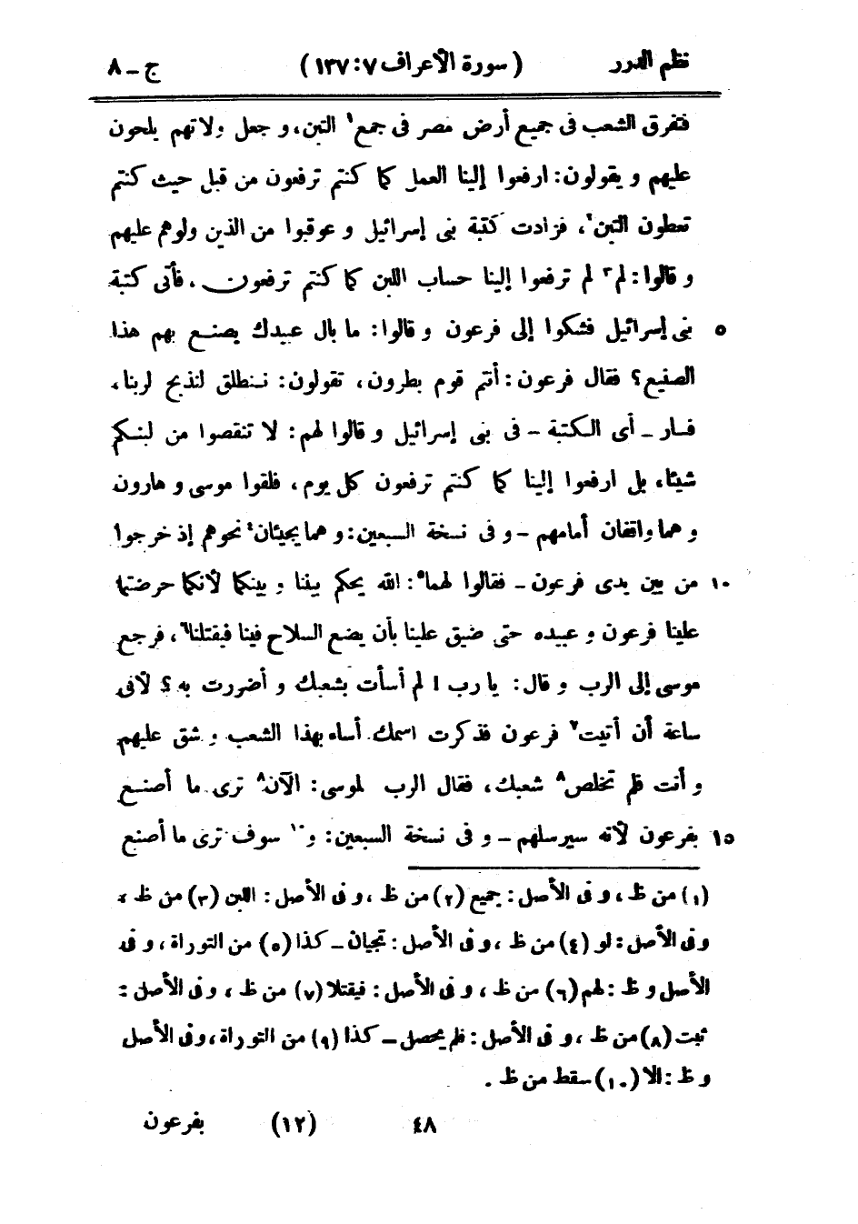 فتقرق الشعب في جميع أرض مصر في جميع التبن، وجعل ولاتهم يلحون عليهم ويقولون: ارفعوا إلينا العمل كما كنتم ترفعون من قبل حيث كنتم تعطون التبن، فزادت كتبة بني إسرائيل وعوقبوا من الذين ولوهم عليهم وقالوا: لم لم ترفعوا إلينا حساب اللبن كما كنتم ترفعون، فأتى كتبة بني إسرائيل فشكوا إلى فرعون وقالوا: ما بال عبيدك يصنع بهم هذا الصنيع؟ فقال فرعون: أنتم قوم بطرون، تقولون: ننطلق لنذبح لربنا، فسار - أي الكتبة - في بني إسرائيل وقالوا لهم: لا تنقصوا من لبنكم شيئاً، بل ارفعوا إلينا كما كنتم ترفعون كل يوم، فلقوا موسى وهارون وهما واقفان أمامهم - وفي نسخة السبعين: وهما يجيئان نحوهم إذ خرجوا من بين يدي فرعون - فقالوا لهما: الله يحكم بيننا وبينكما لأنكما حرضتما علينا فرعون وعبيده حتى ضيق علينا بأن يضع السلاح فينا فيقتلنا، فرجع موسى إلى الرب وقال: يارب! لم أسأت بشعبك وأضررت به؟ لأني ساعة أن أتيت فرعون فذكرت اسمك أساء بهذا الشعب وشق عليهم وأنت تخلص شعبك، فقال الرب لموسى: الآن ترى ما أصنع بفرعون لأنه سيرسلهم - وفي نسخة السبعين: وسوف ترى ما أصنع