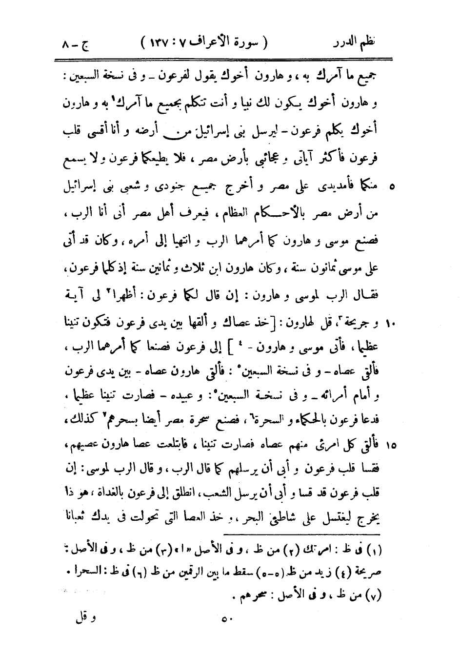 جميع ما آمرك به، وهارون أخوك يقول لفرعون - وفي نسخة السبعين: وهارون أخوك يكون لك نبياً وأنت تتكلم بجميع ما آمرك به وهارون أخوك يكلم فرعون - ليرسل بني إسرائيل من أرضه وأنا أقسي قلب فرعون فأكثر آياتي وعجائبي بأرض مصر، فلا يطيعكما فرعون ولا يسمع منكما فأمد يدي على مصر وأخرج جميع جنودي وشعبي بني إسرائيل من أرض مصر بالأحكام العظام، فيعرف أهل مصر أني أنا الرب، فصنع موسى وهارون كما أمرهما الرب وانتهيا إلى أمره، وكان قد أتى على موسى ثمانون سنة، وكان ابن ثلاث وثمانين سنة إذ كلما فرعون، فقال الرب لموسى وهارون، إن قال لكما فرعون: أظهرا لي آية وجريحة، قل لهارون: خذ عصاك وألقها بين يدي فرعون فتكون تنيناً عظيماً، فأتى موسى وهارون إلى فرعون فصنعا كما أمرهما الرب، فألقى عصاه - وفي نسخة السبعين: فألقى هارون عصاه - بين يدي فرعون وأمام أمرائه- وفي نسخة السبعين: وعبيده - فصارت تنيناً عظيماً، فدعا فرعون بالحكماء والسحرة، فصنع سحرة مصر أيضاً بسحرهم كذلك، فألقى كل امرىء منهم عصاه فصارت تنيناً فابتلعت عصا هارون عصيهم، فقسا قلب فرعون وأبى أن يرسلهم كما قال الرب، وقال الرب لموسى: إن قلب فرعون قد قسا وأبى أن يرسل الشعب، انطلق إلى فرعون بالغداة، هو ذا يخرج ليغتسل على شاطىء البحر، وخذ العصا التي تحولت في يدك ثعباناً
