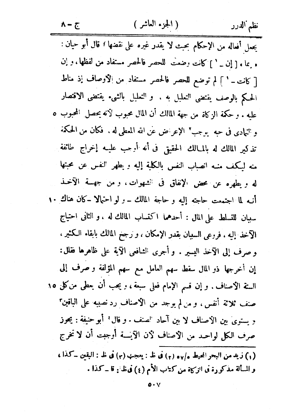 وحكمة الزكاة من جهة المالك أن المال محبوب لأنه يحصل المحبوب والتمادي في حبه يوجب الإعراض عن الله المعطي له، فكان من الحكمة تذكير المالك له بالمالك الحقيقي في أنه أوجب عليه إخراج طائفة منه ليكف منه انصباب النفس بالكلية إليه ويطهر النفس عن محبتها له ويطهره عن محض الإنفاق في الشهوات، ومن جهة الآخذ أنه لما اجتمعت حاجته إليه وحاجة - المالك - ولو احتمالاً- كان هناك سببان للتسلط على المال: أحدهما اكتساب المالك له، والثاني احتياج الآخذ إليه، فروعي السببان بقدر الإمكان، ورجح المالك بإبقاء الكثير، وصرف إلى الآخذ اليسير. وأجرى الشافعي الآية على ظاهرها فقال: إن أخرجها ذو المال سقط سهم العامل مع سهم المؤلفة وصرف إلى الستة الأصناف، وإن قسم الإمام فعلى سبعة، ويجب أن يعطى من كل صنف ثلاثة أنفس، ومن لم يوجد من الأصناف رد نصيبه على الباقين ويستوي بين الأصناف لا بين آحاد الصنف. وقال أبو حنيفة: يجوز صرف الكل لواحد من الأصناف لأن الآية أوجبت أن لا تخرج