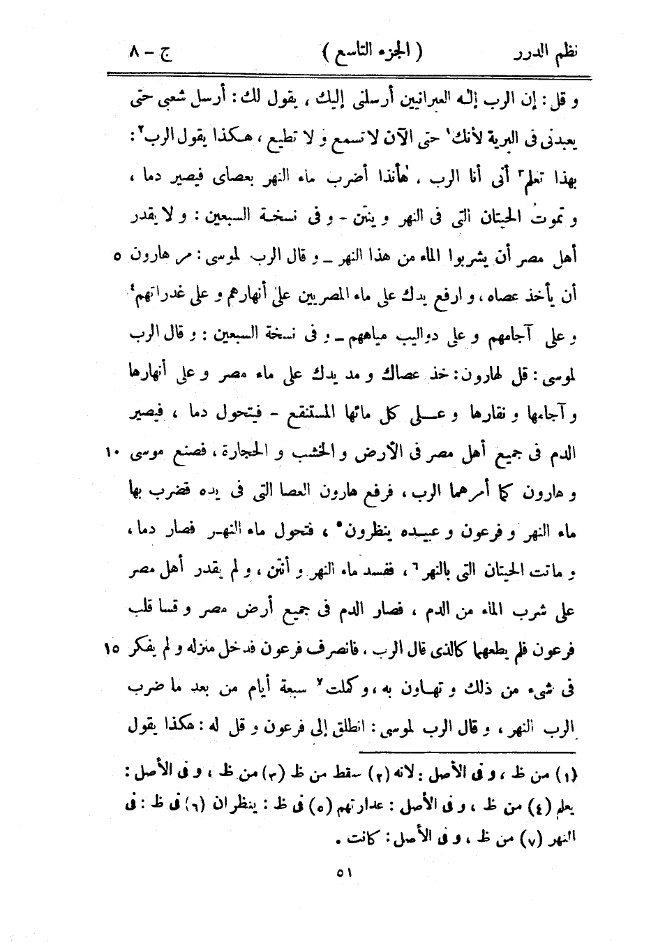وقل: وإن الرب إله العبرانيين أرسلني إليك، يقول لك: أرسل شعبي حتى يعبدني في البرية لأنك حتى الآن لا تسمع ولا تطيع، هكذا يقول الرب: بهذا تعلم أني أنا الرب، هأنذا أضرب ماء النهر بعصاي فيصير دماً، وتموت الحيتان التي في النهر وينتن - وفي نسخة السبعين: ولا يقدر أهل مصر أن يشربوا الماء من هذا النهر - وقال الرب لموسى: مر هارون أن يأخذ عصاه، وارفع يدك على ماء المصريين على أنهارهم وعلى غدرانهم وعلى آجامهم وعلى دواليب مياههم - وفي نسخة السبعين: وقال الرب لموسى: قل لهارون: خذ عصاك ومد يدك على ماء مصر وعلى أنهارها وآجامها ونقارها وعلى كل مائها المستنقع - فيتحول دماً، فيصير الدم في جميع أهل مصر في الأرض والخسب والحجارة، فصنع موسى وهارون كما أمرهما الرب، فرفع هارون العصا التي في يده فضرب بها ماء النهر وفرعون وعبيده ينظرون، فتحول ماء النهر فصار دماً، وماتت الحيتان التي بالنهر، ففسد ماء النهر وأنتن، ولم يقدر أهل مصر على شرب الماء من الدم، فصار الدم في جميع أرض مصر وقسا قلب فرعون فلم يطعهما كالذي قال الرب، فانصرف فرعون فدخل منزله ولم يفكر في شيء من ذلك وتهاون به، وكملت سبعة أيام من بعد ما ضرب الرب النهر، وقال الرب لموسى: انطلق إلى فرعون وقل له: هكذا يقول