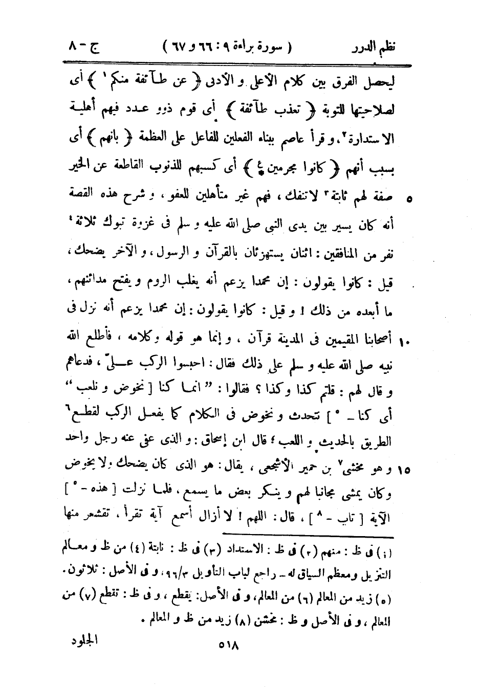 ليحصل الفرق بين كلام الأعلى والأدنى {عن طائفة منكم} أي لصلاحيتها للتوبة {نعذب طائفة} أي قوم ذوو عدد فيهم أهلية الاستدارة، وقرأ عاصم ببناء الفعلين للفاعل على العظمة {بأنهم} أي بسبب أنهم {كانوا مجرمين*} أي كسبهم للذنوب القاطعة عن الخير صفة لهم ثابتة لا تنفك، فهم غير متأهلين للعفو، وشرح هذه القصة أنه كان يسير بين يدي النبي صَلَّى اللهُ عَلَيْهِ وَسَلَّمَ في غزوة تبوك ثلاثة نفر من المنافقين: اثنان يستهزئان بالقرآن والرسول، والآخر يضحك، قيل: كانوا يقولون: إن محمداً يزعم أنه يغلب الروم ويفتح مدائنهم، ما أبعده من ذلك! وقيل: كانوا يقولون: إن محمداً يزعم أنه نزل في أصحابنا المقيمين في المدينة قرآن، وإنما هو قوله وكلامه، فأطلع الله نبيه صَلَّى اللهُ عَلَيْهِ وَسَلَّمَ على ذلك فقال: احسبوا الركب عليّ، فدعاهم وقال لهم: قلتم كذا وكذا؟ فقالوا: {إنما كنا نخوض ونلعب} أي كنا نتحدث ونخوض في الكلام كما يفعل الركب لقطع الطريق بالحديث واللعب، قال ابن اسحاق: والذي عفى عنه رجل واحد وهو مخشي بن حمير الأشجعي، يقال: هو الذي كان يضحك، ولا يخوض وكان يمشي مجانباً لهم وينكر بعض مايسمع، فلما نزلت هذه الآية تاب.