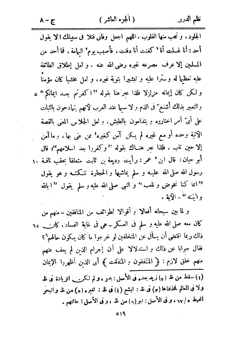 الجلود، وتجب منها القلوب، اللهم اجعل وفاتي قتلاً في سبيلك! لا يقول أحد: أنا غسلت أنا كفنت أنا دفنت، فأصيب يوم اليمامة، فما أحد من المسلمين إلا عرف مصرعه غيره رضي الله عنه. ولعل إطلاقاً الطائفة عليه تعظيماً له وستراً عليه وتبشيراً بتوبة غيره، ولعل مخشياً كان مؤمناً ولكن كان إيمانه مزلزلاً فلذا عبر هنا بقوله {أكفرتم بعد إيمانكم} والتعبير بذلك أشنع في الذم ولا سيما عند العرب لأنهم يتمادحون بالثبات على أيّ أمر اختاروه ويتذامون بالطيش، ولعل الجلاس المعنيّ بالقصة الآتية وحده أو مع غيره لم يكن آمن كغيره ممن عني بها، وما آمن إلا حين تاب، فلذا عبر هناك بقوله: {وكفروا بعد إسلامهم} ؛ قال أبو حيان: قال ابن عمر: «رأيت وديعة بن ثابت متعلقاً بحقب ناقة رسول الله صَلَّى اللهُ عَلَيْهِ وَسَلَّمَ يماشيها والحجارة تنكته وهو يقول {إنما كنا نخوض ونلعب} والنبي صَلَّى اللهُ عَلَيْهِ وَسَلَّمَ يقول:» أبالله وآياته «- الآية.