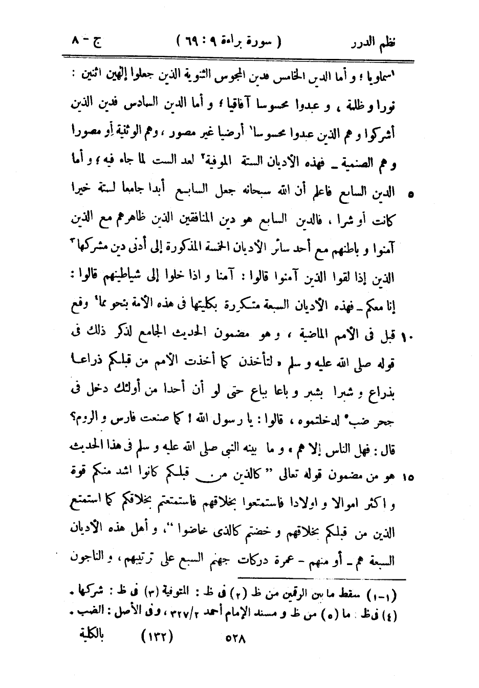 سماوياً؛ وأما الدين الخامس فدين المجوس الثنوية الذين جعلوا إلهين اثنين: نوراً وظلمة، وعبدوا محسوساً آفاقياً، وأما الدين السادس فدين الذين أشركوا وهم الذين عبدوا محسوساً أرضياً غير مصور، وهم الوثنية أو مصوراً وهم الصنمية - فهذه الأديان الستة الموفية لعد الست لما جاء فيه؛ وأما الدين السابع فاعلم أن الله سبحانه حعل السابع أبداً جامعاً لستة خيراً كانت أو شراً، فالدين السابع هو دين المنافقين الذين ظاهرهم مع الذين آمنوا وباطنهم مع أحد سائر الأديان الخمسة المذكورة إلى أدنى دين مشركها الذين إذا لقوا الذين آمنوا قالوا: آمنا واذا خلوا إلى شياطينهم قالوا: إنا معكم - فهذه الأديان السبعة متكررة بكليتها في هذه الأمة بنحو مما وقع قبل في الأمم الماضية، وهو مضمون الحديث الجامع لذكر ذلك في قوله صَلَّى اللهُ عَلَيْهِ وَسَلَّمَ «لتأخذنَّ كما أخذت الأمم من قبلكم ذراعاً بذراع وشبراً بشبر وباعاً بباع حتى لو أن أحداً من أولئك دخل في حجر ضب لدخلتموه، قالوا: يارسول الله! كما صنعت فارس والروم؟ قال: فهل الناس إلا هم» وما بينه النبي صَلَّى اللهُ عَلَيْهِ وَسَلَّمَ في هذا الحديث هو من مضمون قوله تعالى {كالذين من قبلكم كانوا أشد منكم قوة وأكثر أموالاً وأولاداً فاستمتعوا بخلاقهم فاستمعتم بخلاقكم كما استمتع الذين من قبلكم بخلاقهم وخضتم كالذي خاضوا} ، وأهل هذه الأديان السبعة - أو منهم - عمرة دركات جهنم السبع على ترتيبهم، والناجون