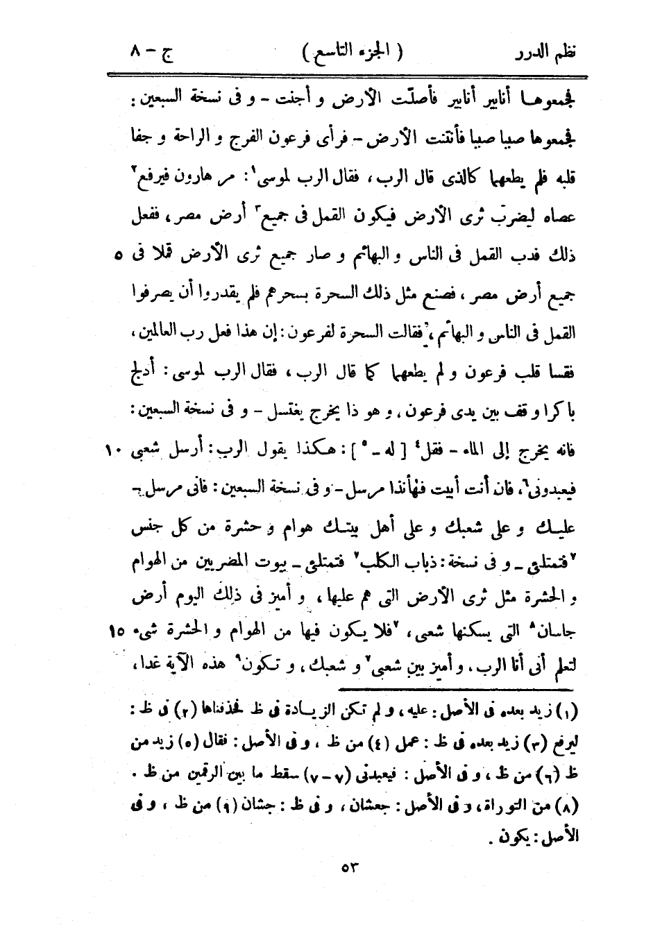 فجمعوها أنابير أنابير فأصلّت الأرض وأجنت - وفي نسخة السبعين: فجمعوها صبباً صبباً فأنتنت الأض - فرأى فرعون الفرج والراحة وجفا قلبه فلم يطعهما كالذي قال الرب، فقال الرب لموسى: مر هارون فيرفع عصاه ليضرب ثرى الأرض فيكون القمل في جميع أرض مصر، ففعل ذلك فدب القمل في الناس والبهائم وصار جميع ثرى الأرض قملاً في جميع أرض مصر، فصنع مثل ذلك السحرة بسحرهم فلم يقدروا أن يصرفوا القمل في الناس والبهائم، فقالت السحرة لفرعون: إن هذا فعل رب العالمين، فقسا قلب فرعون ولم يطعهما كما قال الرب، فقال الرب لموسى: أدلج باكراً وقف بين يدي فرعون، وهو ذا يخرج يغتسل - وفي نسخة السبعين: فإنه يخرج إلى الماء - فقل له: هكذا يقول الرب: أرسل شعبي فيعبدوني، فإن أنت أبيت فهأنذا مرسل - وفي نسخة السبعين: فإني مرسل - عليك وعلى شعبك وعلى أهل بيتك هوام وحشرة من كل جنس فتمتلىء - وفي نسخة: ذباب الكلب فتمتلىء - بيوت المصريين من الهوام والحشرة مثل ثرى الأرض التي هم عليها، وأميز في ذلك اليوم أرض جاسان التي يسكنها شعبي، فلا يكون فيها من الهوام والحشرة شيء لتعلم أني أنا الرب، وأميز بين شعبي وشعبك، وتكون هذه الآية غداً،