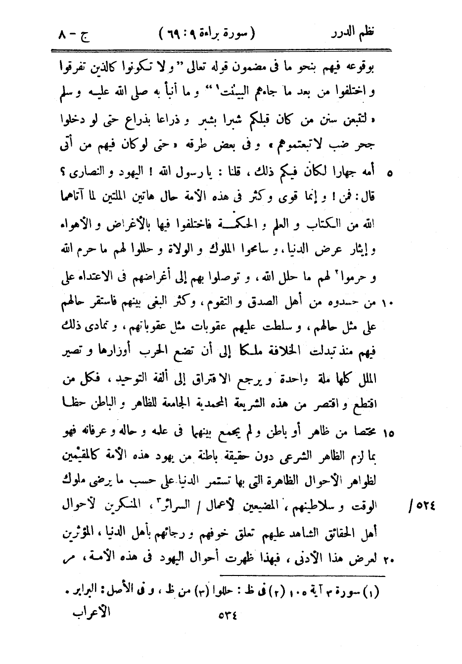 بوقوعه فيهم بنحو ما في مضمون قوله تعالى: {ولا تكونوا كالذين تفرقوا واختلفوا من بعد ما جاءهم البينات} [آل عمران: 105] وما أنبأ به صَلَّى اللهُ عَلَيْهِ وَسَلَّمَ «لتتبعن سنن من كان قبلكم شبراً بشبر وذراعاً بذراع حتى لو دخلوا حجر ضب لاتبعتموهم» وفي بعض طرقه «حتى لو كان فيهم من أتى أمه جهاراً لكان فيكم ذلك، قلنا: يارسول الله! اليهود والنصارى؟ قال: فمن؟» وإنما قوي وكثر في هذه الأمة حال هاتين الملتين لما آتاهما الله من الكتاب والعلم والحكمة فاختلفوا فيها بالأغراض والأهواء وإيثار عرض الدنيا، وسامحوا الملوك والولاة وحللوا لهم ما حرم الله وحرموا لهم ما حلل الله، وتوصلوا بهم إلى أغراضهم في الاعتداء على من حسدوه من أهل الصدق والتقوم، وكثر البغي بينهم فاستقر حالهم على مثل حالهم، وسلطت عليهم عقوبات مثل عقوباتهم، وتمادى ذلك فيهم منذ تبدلت الخلافة ملكاً إلى أن تضع الحرب أوزارها وتصير الملل كلها ملة واحدة ويرجع الافتراق إلى ألفة التوحيد، فكل من اقتطع واقتصر من هذه الشريعة المحمدية الجامعة للظاهر والباطن حظاً مختصاً من ظاهر أو باطن ولم يجمع بينهما في علمه وحاله وعرفانه فهو بما لزم الظاهر الشرعي دون حقيقة باطنه من يهود هذه الأمة كالمقيمين لظواهر الأحوال الظاهر التي بها تستمر الدنيا على حسب ما يرضى ملوك الوقت وسلاطينهم، المضيعين لأعمال السرائر، المنكرين لأحوال أهل الحقائق الشاهد عليهم تعلق خوفهم ورجائهم بأهل الدنيا، المؤثرين لعرض هذا الأدنى، فبهذا ظهرت أحوال اليهود في هذه الأمة، مر