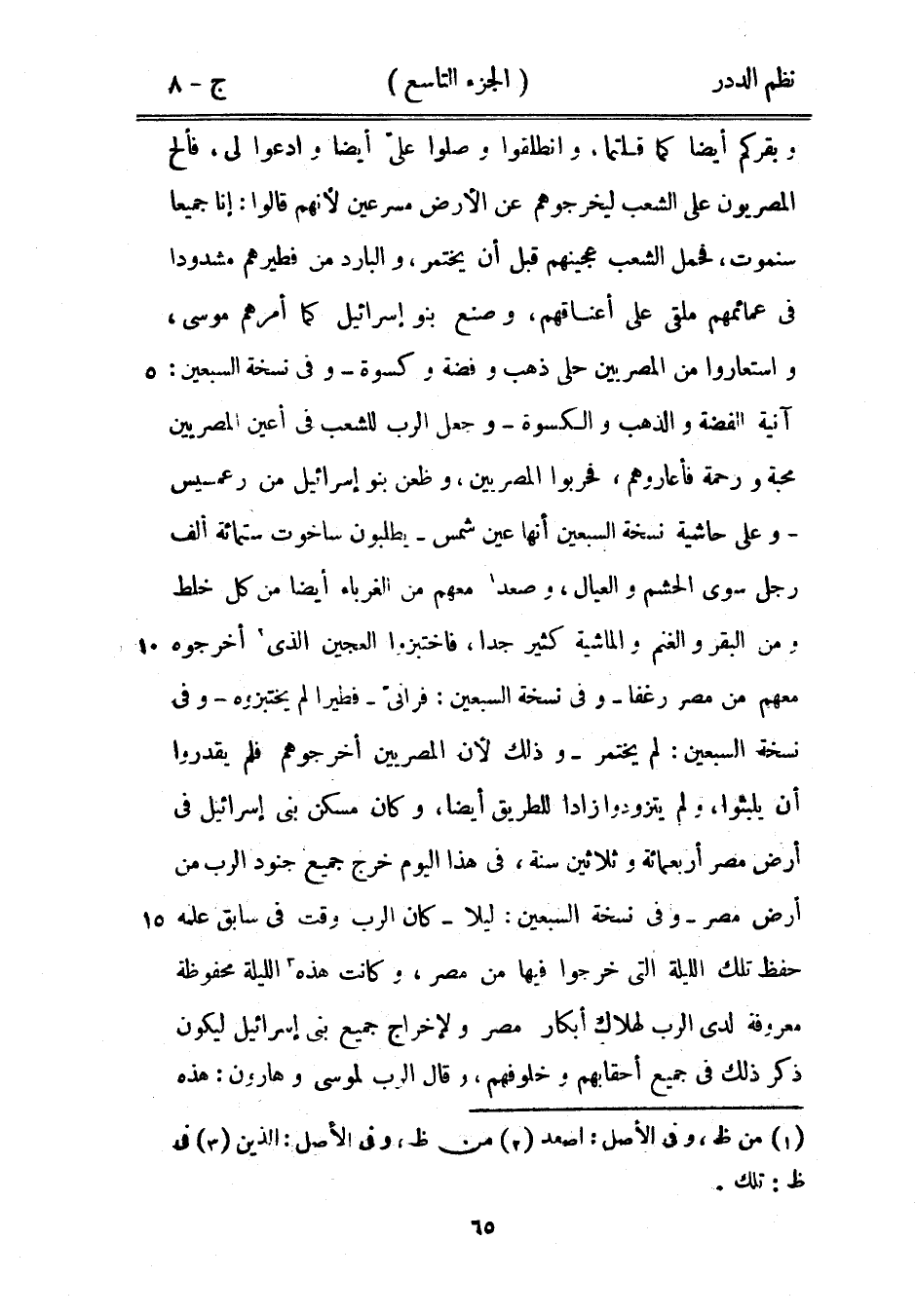 وبقركم أيضاً كما قلتما، وانطلقوا وصلوا عليّ أيضاً وادعوا لي، فألح المصريون على الشعب ليخرجوهم عن الأرض مسرعين لأنهم قالوا: إنا جميعاً سنموت، فحمل الشعب عجينهم قبل أن يختمر، والبارد من فطيرهم مشدوداً في عمائمهم ملقى أعناقهم، وصنع بنو إسرائيل كما أمرهم موسى، واستعاروا من المصريين حلي ذهب وفضة وكسوة - وفي نسخة السبعين: آنية الفضة والذهب والكسوة - وجعل الرب للشعب في أعين المصريين محبة ورحمة فأعاروهم، فحربوا المصريين، وظعن بنو إسرائيل من رعمسيس - وعلى حاشية نسخة السبعين أنها عين شمس - يطلبون ساخوت ستمائة ألف رجل سوى الحشم والعيال، وصعد معهم من الغرباء أيضاً من كل خلط ومن البقر والغنم والماشية كثيراً جداً، فاختبزوا العجين الذي أخرجوه معهم من مصر رغفاً - وفي نسخة السبعين: فرانيّ - فطيراً لم يختبزوه - وفي نسخة السبعين: لم يختمر- وذلك لأن المصريين أخرجوهم فلم يقدروا أن يلبثوا، ولم يتزودوا زاداً للطريق أيضاً، وكان مسكن بني إسرائيل في أرض مصر أربعمائة وثلاثين سنة، في هذا اليوم خرج جميع جنود الرب من أرض مصر- وفي نسخة السبعين: ليلاً - كان الرب وقت في سابق علمه حفظ تلك الليلة التي خرجوا فيها من مصر، وكانت هذه الليلة محفوظة معروفة لدى الرب لهلاك أبكار مصر ولإخراج جميع بني إسرائيل ليكون ذكر ذلك في جميع أحقابهم وخلوفهم، وقال الرب لموسى وهارون: هذه