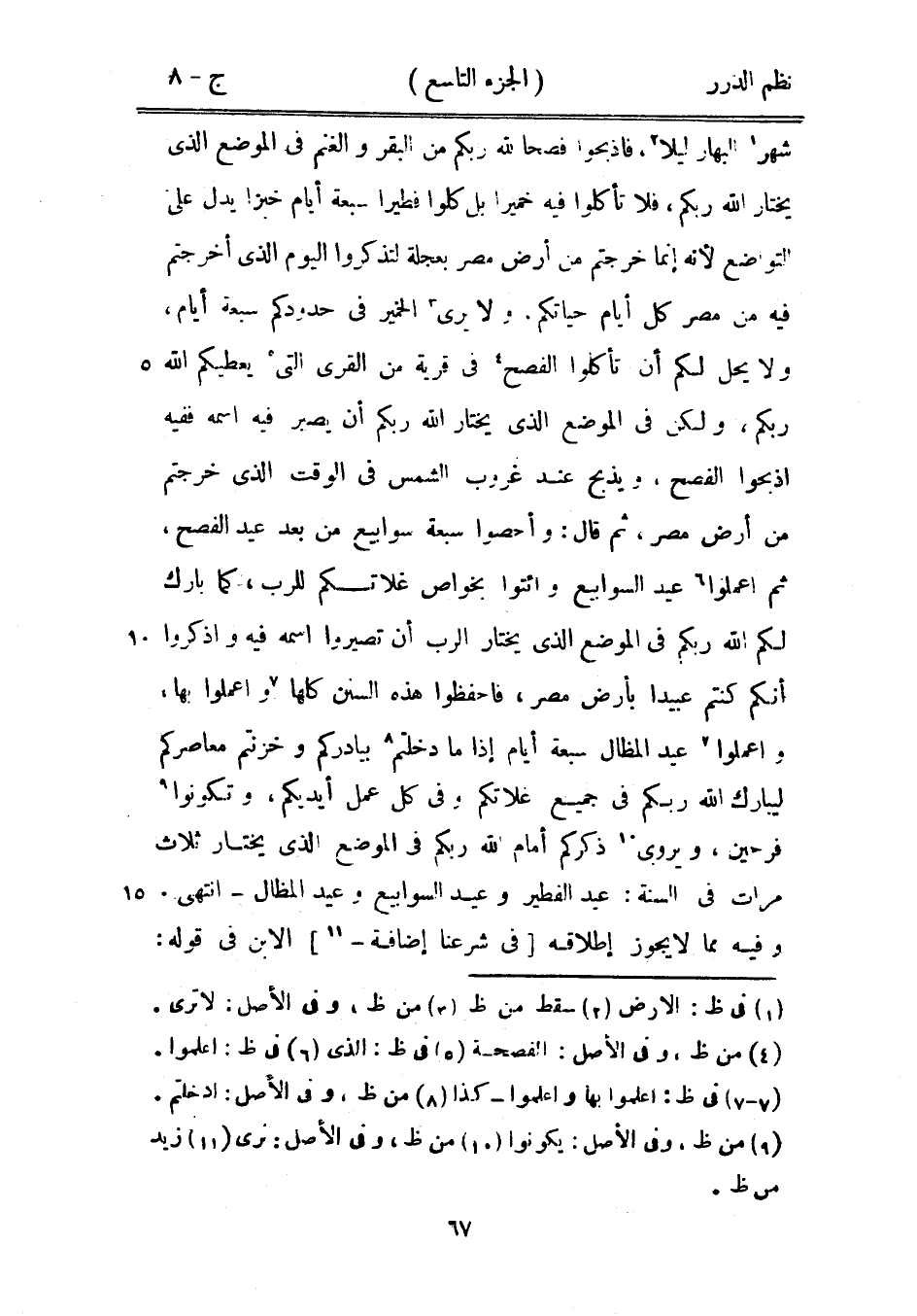 شهر البهار ليلاً، فاذبحوا فصحاً لله ربكم من البقر والغنم في الموضع الذي يختار الله ربكم، فلأ تأكلوا فيه خميراً بل كلوا فطيراً سبعة أيام خبزاً يدل على التواضع لأنه إنما خرجتم من أرض مصر بعجلة لتذكروا اليوم الذي أخرجتم فيه من مصر كل أيام حياتكم، ولا يرى الخمير في حدودكم سبعة أيام، ولا يحل لكم أن تأكلوا الفصح في قرية من القرى التى يعطيكم الله ربكم، ولكن في الموضع الذي يختار الله ربكم أن يصير فيه اسمه ففيه اذبحوا الفصح، ويذبح عند غروب الشمس في الوقت الذي خرجتم من أرض مصر، ثم قال: وأحصوا سبعة سوابيع من بعد عيد الفصح، ثم اعملوا عيد السوابيع وائتوا بخواص غلاتكم للرب، كما بارك لكم الله ربكم في الموضع الذي يختار الرب أن تصيروا اسمه فيه واذكروا أنكم كنتم عبيداً بأرض مصر، فاحفظوا هذه السنن كلها واعملوا بها، واعملوا عيد المظال سبعة أيام إذا ما دخلتم بيادركم وخزنتم معاصركم ليبارك الله ربكم في جميع غلاتكم وفي كل عمل أيديكم، وتكونوا فرحين، ويروى ذكركم أمام الله ربكم في الموضع الذي يختار ثلاث مرات في السنة: عيد الفطر وعيد السوابيع وعيد المظال - انتهى.