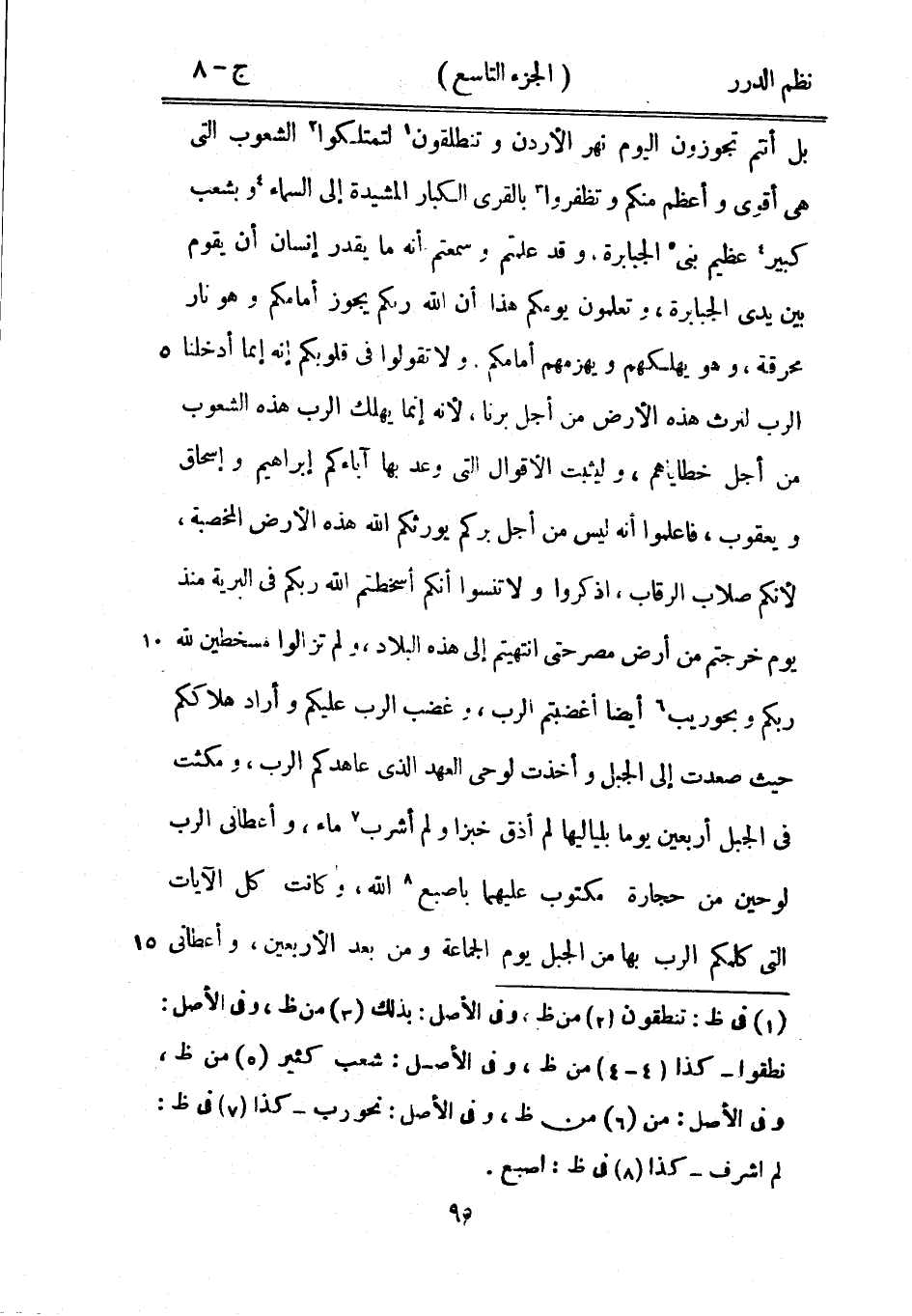 بل أنتم تجوزون اليوم نهر الأردن وتنطلقون لتمتلكوا الشعوب التي هي أقوى وأعظم منكم وتظفروا بالقرى الكبار المشيدة إلى السماء وبشعب كبير عظيم بني الجبابرة، وقد علمتم وسمعتم أنه ما يقدر إنسان أن يقوم بين يدي الجبابرة، وتعلمون يومكم هذا أن الله ربكم يجوز أمامكم وهو نار محرقة، وهو يهلكهم ويهزمهم أمامكم، ولا تقولوا في قلوبكم إنه إنما أدخلنا الرب ليرث هذه الأرض من أجل برنا، لأنه إنما يهلك الرب هذه الشعوب من أجل خطاياهم، وليثبت الأقوال التي وعد بها آباءكم إبراهيم وإسحاق ويعقوب، فاعلموا أنه ليس من أجل بركم يورثكم الله هذه الأرض المخصبة، لأنكم صلاب الرقاب، اذكروا ولا تنسوا أنكم أسخطتم الله ربكم في البرية منذ يوم خرجتم من أرض مصر حتى انتهيتم إلى هذه البلاد، ولم تزالوا مسخطين لله ربكم ونحوريت أيضاً أغضبتم الرب، وغضب الرب عليكم وأراد هلاككم حيث صعدت إلى الجبل وأخذت لوحي العهد الذي عاهدكم الرب، ومكثت في الجبل أربعين يوماً بلياليها لم أذق خبزاً ولم أشرب ماء، وأعطاني الرب لوحين من حجارة مكتوب عليهما بأصبع الله، وكانت كل الآيات التي كلمكم الرب بها من الجبل يوم الجمعة ومن بعد الأربعين، وأعطاني