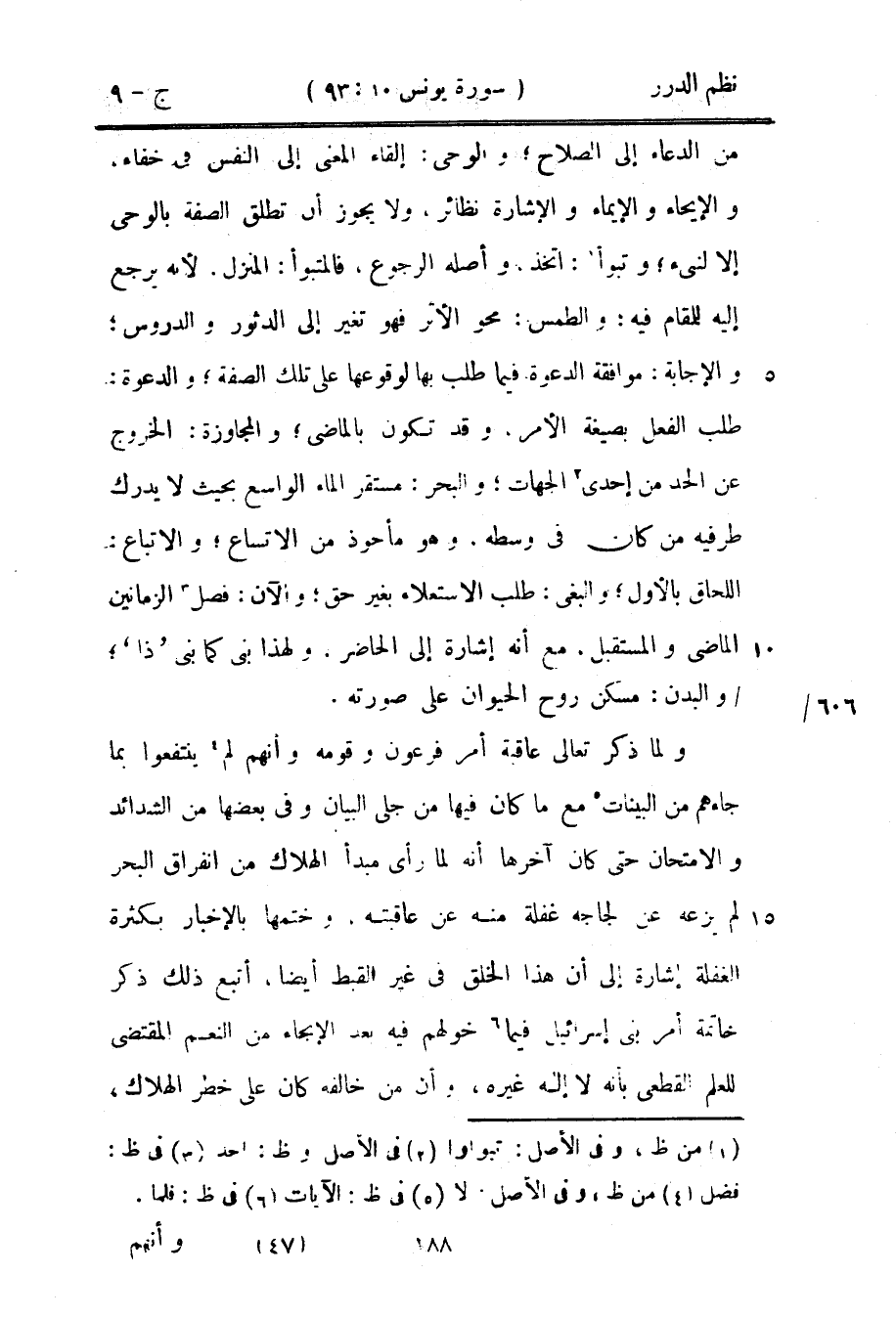 من الدعاء إلى الصلاح؛ والوحي: إلقاء المعنى إلى النفس في خفاء، والإيحاء والإيماء والإشارة نظائر، ولا يجوز أن تطلق الصفة بالوحي إلا لنبي؛ وتبوأ: اتخذ، وأصله الرجوع، فالمتبوأ: المنزل، لأنه يرجع إليه للمقام فيه: والطمس: محو الأثر فهو تغير إلى الدثور والدروس؛ والإجابة: موافقة الدعوة فيما طلب بها لوقوعها على تلك الصفة؛ والدعوة: طلب الفعل بصيغة الأمر، وقد تكون بالماضي؛ والمجاوزة: الخروج عن الحد من إحدى الجهات؛ والبحر: مستقر الماء الواسع بحيث لا يدرك طرفيه من كان في وسطه، وهو مأخوذ من الاتساع؛ والاتباع: اللحاق بالأول؛ والبغي: طلب الاستعلاء بغير حق؛ والآن: فصل الزمانين الماضي والمستقبل، ومع أنه إشارة إلى الحاضر، ولهذا بنى كما بنى «ذا» ؛ والبدن: مسكن روح الحيوان على صورته.