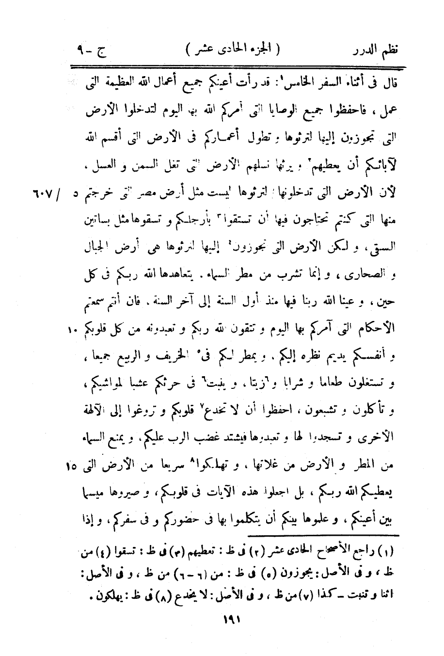 قال قي أثناء السفر الخامس: قد رأت أعينكم جميع أعمال الله العظيمة التي عمل، فاحفظوا جميع الوصايا التي أمركم الله بها اليوم لتدخلوا الأرض التي تجوزون إليها لترثوها وتطول أعماركم في الأرض التي أقسم الله لآبائكم أن يعطيهم ويرثها نسلهم الأرض التي تغل السمن والعسل. لأن الأرض التي تدخلونها لترثوها ليست مثل أرض مصر التي خرجتم منها التي كنتم تحتاجون فيها أن تستقوا بأرجلكم وتسقوها مثل بساتين السقي، ولكن الأرض التي تجوزون إليها لترثوها هي أرض الجبال والصحارى، وإنما تشرب من مطر السماء. يتعاهدها الله ربكم في كل حين، وعينا الله ربنا فيها منذ أول السنة إلى آخر السنة. فإن أنتم سمعتم الأحكام التي آمركم بها اليوم وتتقون الله ربكم وتعبدونه من كل قلوبكم وأنفسكم يديم نظره إليكم، ويمطر لكم في الخريف والربيع جميعاً، وتستغلون طعاماً وشراباً وزيتاً، وينبت في حرثكم عشباً لمواشيكم، وتأكلون وتشبعون، احفظوا أن لا تخدع قلوبكم وتروغوا إلى الآلهة الأخرى وتسجدوا لها وتعبدوها فيشتد غضب الرب عليكم، ويمنع السماء من المطر والأرض من غلاتها، وتهلكوا سريعاً من الأرض التي يعطيكم الله ربكم، بل اجعلوا هذه الآيات في قلوبكم، وصيروها ميسماً بين أعينكم، وعلموها بينكم أن يتكلموا بها في حضوركم وفي سفركم، وإذا