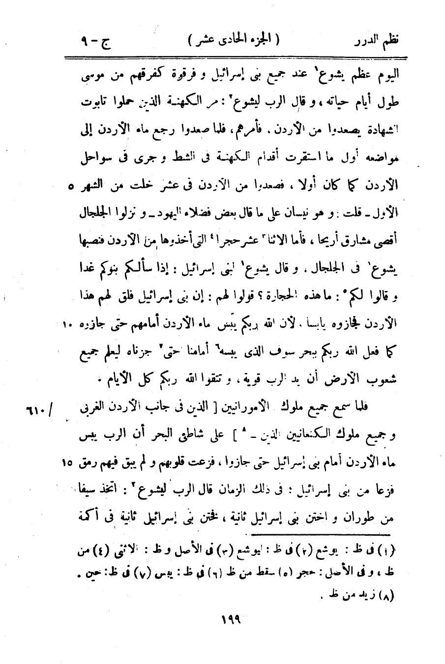 اليوم عظم يشوع عند جميع بني إسرائيل وفرقوه كفرقهم من موسى طول أيام حياته، وقال الرب ليشوع: مر الكهنة الذين حملوا تابوت الشهادة يصعدوا من الأردن، فأمرهم، فلما صعدوا رجع ماء الأردن إلى مواضعه أول ما استقرت أقدام الكهنة في الشط وجرى في سواحل الأردن كما كان أولاً، فصعدوا من الأردن في عشر خلت من الشهر الأول - قلت: وهو نيسان على ما قال بعض فضلاء اليهود - ونزلوا الجلجال أقصى مشارق أريحا، فأما الاثنا عشر حجراً التي أخذوها من الأردن فنصبها يشوع في الجلجال، وقال يشوع لبني إسرائيل: إذا سألكم بنوكم غداً وقالوا لكم: ما هذه الحجارة؟ قولوا لهم: إن بني إسرائيل فلق له هذا الأردن فجازوه يابساً، لأن الله ربكم يبَّس ما الأردن أمامهم حتى جازوه كما فعل الله ربكم ببحر سوف الذي يبسه أمامنا حتى جزناه ليعلم جميع شعوب الأرض أن يد الرب قوية، وتتقوا الله ربكم كل الأيام.