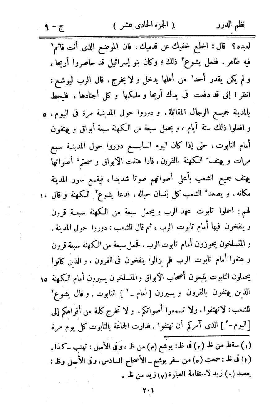 لعبده؟ قال: اخلع خفيك عن قدميك، فإن الموضع الذي أنت قائم فيه طاهر، ففعل يشوع ذلك؛ وكان بنو إسرائيل قد حاصروا أريحا، ولم يكن يقدر أحد من أهلها يدخل ولا يخرج، قال الرب ليوشع: انظر! إني قد دفعت في يدك أريحا وملكها وكل أجنادها، فليحط بالمدينة جميع رجال المقاتلة، ودوروا حول المدينة مرة في اليوم، وافعلوا ذلك ستة أيام، ويحمل سبعة من الكهنة سبعة أبواق ويهتفون أمام التابوت، حتى إذا كان اليوم السابع دوروا حول المدينة سبع مرات ويهتف الكهنة بالقرون، فإذا هتفت الأبواق وسمعتهم أصواتها يهتف جميع الشعب بأعلى أصواتهم صوتاً شديداً، فيقع سور المدينة مكانه، ويصعد الشعب كل إنسان حياله، فدعا يشوع الكهنة وقال لهم: احملوا تابوت الرب عهد الرب ويحمل سبعة من الكهنة سبعة قرون وينفخون فيها أمام تابوت الرب، ثم قال للشعب: دوروا حول المدينة، والمتسلخون يجوزون أمام تابوت الرب، فحمل سبعة من الكهنة سبعة قرون وهتفوا أمام تابوت الرب فلم يزالوا ينفخون في القرون، والذين كانوا يحملون التابوت يتبعون أصحاب الأبواق والمتسلخون يسيرون أمام الكهنة الذي يهتفون بالقون ويسيرون أمام التابوت.