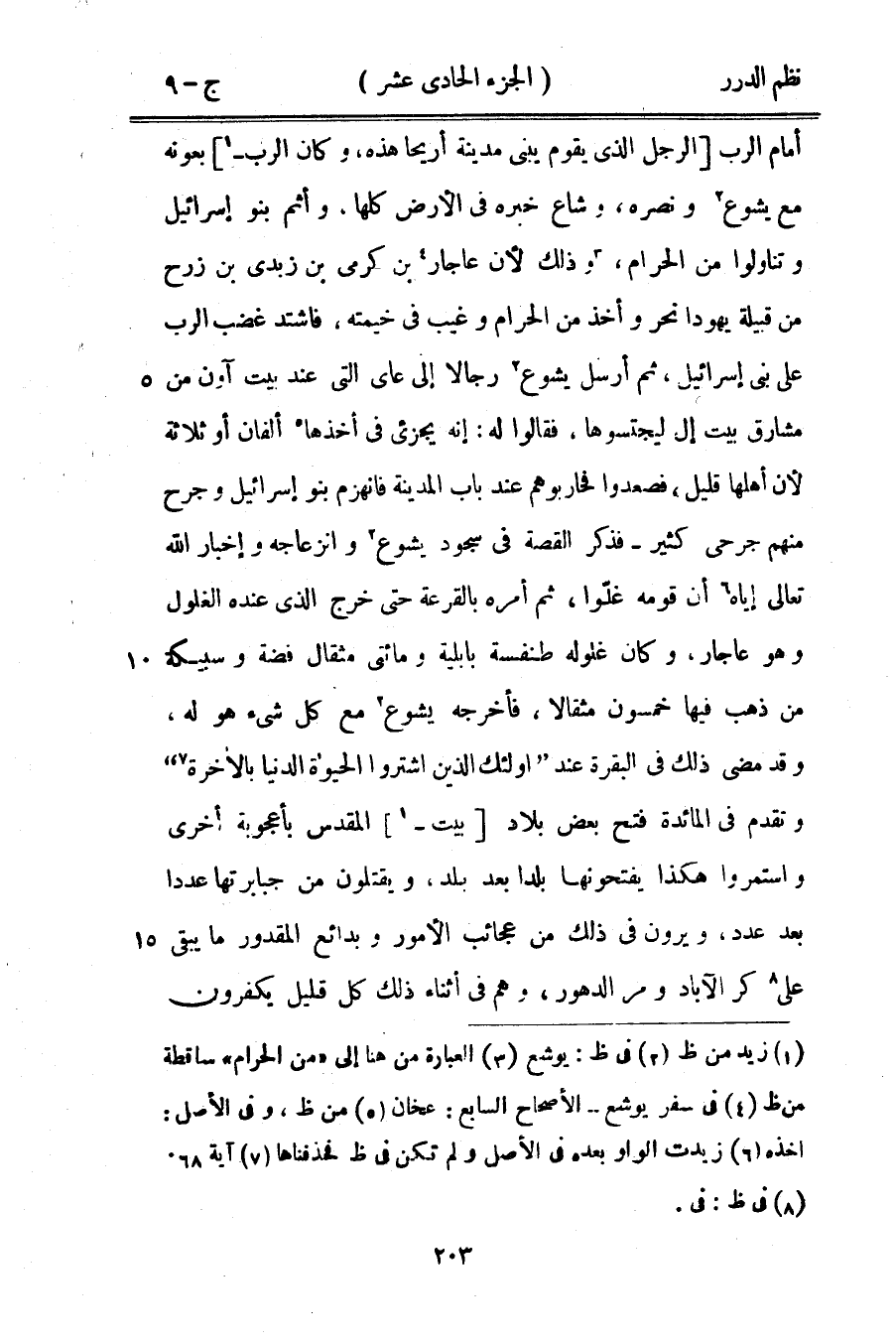 أمام الرب الرجل الذي يقوم يبني مدينة أريحا هذه، وكان الرب بعونه مع يشوع ونصره، وشاع خبره في الأرض كلها، وأثم بنو إسرائيل وتناولوا من الحرام، وذلك لأن عاجار ابن كرمي بن زبدي بن زرح من قبيلة يهودا نحر وأخذ من الحرام وغيب في خيمته، فاشتد غضب الرب على بني إسرائيل، ثم أرسل يشوع رجالاً إلى عاي التي عند بيت آون من مشارق بيت إل ليجتسوها، فقالوا له: إنه يجزىء في أخذها ألفان أو ثلاثة لأن أهلها قليل، فصعدوا فحاربوهم عند باب المدينة فانهزم بنو إسرائيل وجرح منهم جرحى كثير - فذكر القصة في سجود يشوع وانزعاجه وإخبار الله تعالى إياه أن قومه غلّوا، ثم أمره بالقرعة حتى خرج الذي عنده الغلول وهو عاجار، وكان غلوله طنفسة بابلية ومائتي مثقال فضة وسبيكة من ذهب فيها خمسون مثقالاً، فأخرجه يشوع مع كل شيء هو له، وقد مضى ذلك في البقرة عند
