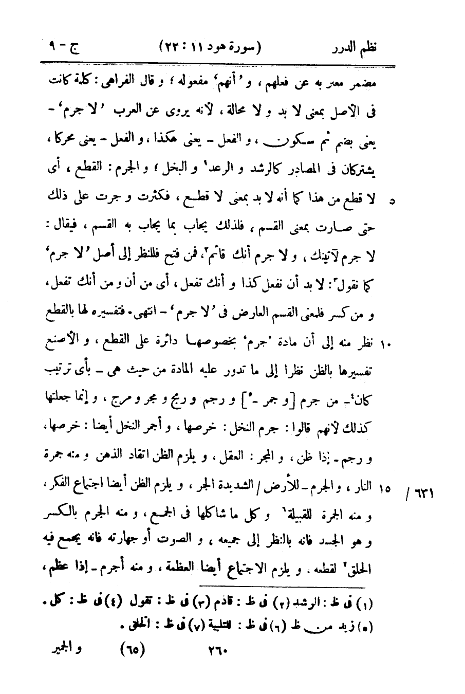 فتفسيره لها بالقطع نظر منه إلى أن مادة «جرم» بخصوصها دائرة على القطع، والأصنع تفسيرها بالظن نظراً إلى ما تدور عليه المادة من حيث هي - بأي ترتيب كان - من جرم وجمر ورجم ورمج ومجر ومرج، وإنما جعلتها كذلك لأنهم قالوا جرم النخل: خرصها، وأجمر النخل أيضاً: خرصها، ورجم - إذا ظن، والمجر: العقل، ويلزم الظن اتقاد الذهن ومنه جمرة النار، والجرم - للأرض الشديدة الجر، ويلزم الظن أيضاً اجتماع الفكر، ومنه الجمرة للقلبية وكل ما شاكلها في الجمع، ومنه الجرم بالكسر وهو الجسد فإنه بالنظر إلى جميعه، والصوت أو جهارته فإنه يجمع فيه الحلق لقطعه، ويلزم الاجتماع أيضاً العظمة، ومنه أجرم - إذا عظم،