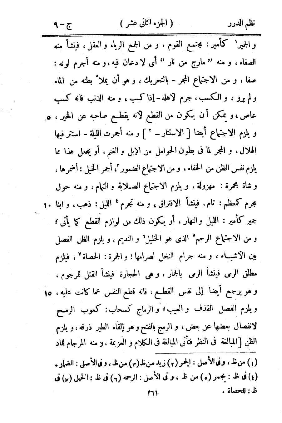 والجمير كأمير: مجتمع القوم، ومن الجمع الرياء والعقل، فينشأ منه الصفاء، ومنه {مارج من نار} أي لا دخان فيه، ومنه أجرم لونه: صفا، ومن الاجتماع المجر - بالتحريك، وهو أن يملأ بطنه من الماء ولم يرو، والكسب، جرم لأهله - إذا كسب، ومنه الذنب فإنه كسب خاص، ويمكن أن يكون من القطع لأنه يقطع صاحبه عن الخير، ويلزم الاجتماع أيضاً الاستتار ومنه أجمرت الليلة - استتر فيها الهلال، والمجر لما في بطون الحوامل من الإبل والغنم، أو يجعل هذا مما يلزم نفس الظن من الخفاء، ومن الاجتماع الضمور، أجمر الخيل: أضمرها، وشاة مجمرة: مهزولة، ويلزم الاجتماع الصلابة والتمام، ومنه حول مجرم كمعظم: تام، فينشأ الافتراق، ومنه تجرم الليل: ذهب، وابنا جمير كأمير: الليل والنهار، أو يكون ذلك من لوازم القطع كما يأتي؛ ومن الاجتماع الرجم الذي هو الخليل والنديم، ويلزم الظن الفصل بين الأشياء، ومنه جرام النخل لصرامها؛ والجمرة: الحصاة، فيلزم مطلق الرمي فينشأ الرمي بالجمار، وهي الحجارة فينشأ القتل للمرجوم، وهو يرجع أيضاً إلى نفس القطع، فإنه قطع النفس عما كانت عليه، ويلزم الفصل القذف والعيب؛ والرماج كسحاب: كعوب الرمح لانفصال بعضها عن بعض، والرمج بالفتح وهو إلقاء الطير ذرقه، ويلزم الظن المبالغة في النظر فتأتي المبالغة في الكلام والعزيمة، ومنه المرجام للماد