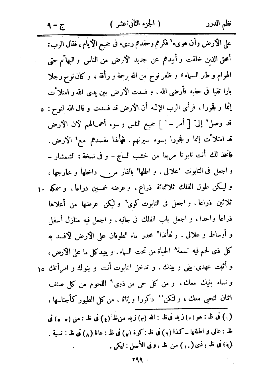 فهأنذا مفسدهم مع الأرض فاتخذ لك أنت تابوتاً مربعاً من خشب الساج - وفي نسخة: الشمشار - وأجعل في التابوت علالي. واطلها بالقار من داخلها وخارجها، وليكن طول الفلك ثلاثمائة ذراع. وعرضه خمسين ذراعاً، وسمكه ثلاثين ذراعاً، واجعل في التابوت كوى وليكن عرضها من أعلاها ذراعاً واحداً، واجعل باب الفلك في جانبه، واجعل فيه منازل أسفل وأوساط وعلالي. وها أنذا محدر ماء الطوفان على الأرض لأفسد به كل ذي لحم فيه نسمة الحياة من تحت السماء، ويبيد كل ما على الأرض، وأثبت عهدي بيني وبينك. وتدخل التابوت أنت وبنوك وامرأتك ونساء بنيك معك، ومن كل حي من ذوي اللحوم من كل صنف اثنان لتحيى معك، ولتكن ذكوراً وإناثاً، من كل الطيور كأجناسها.