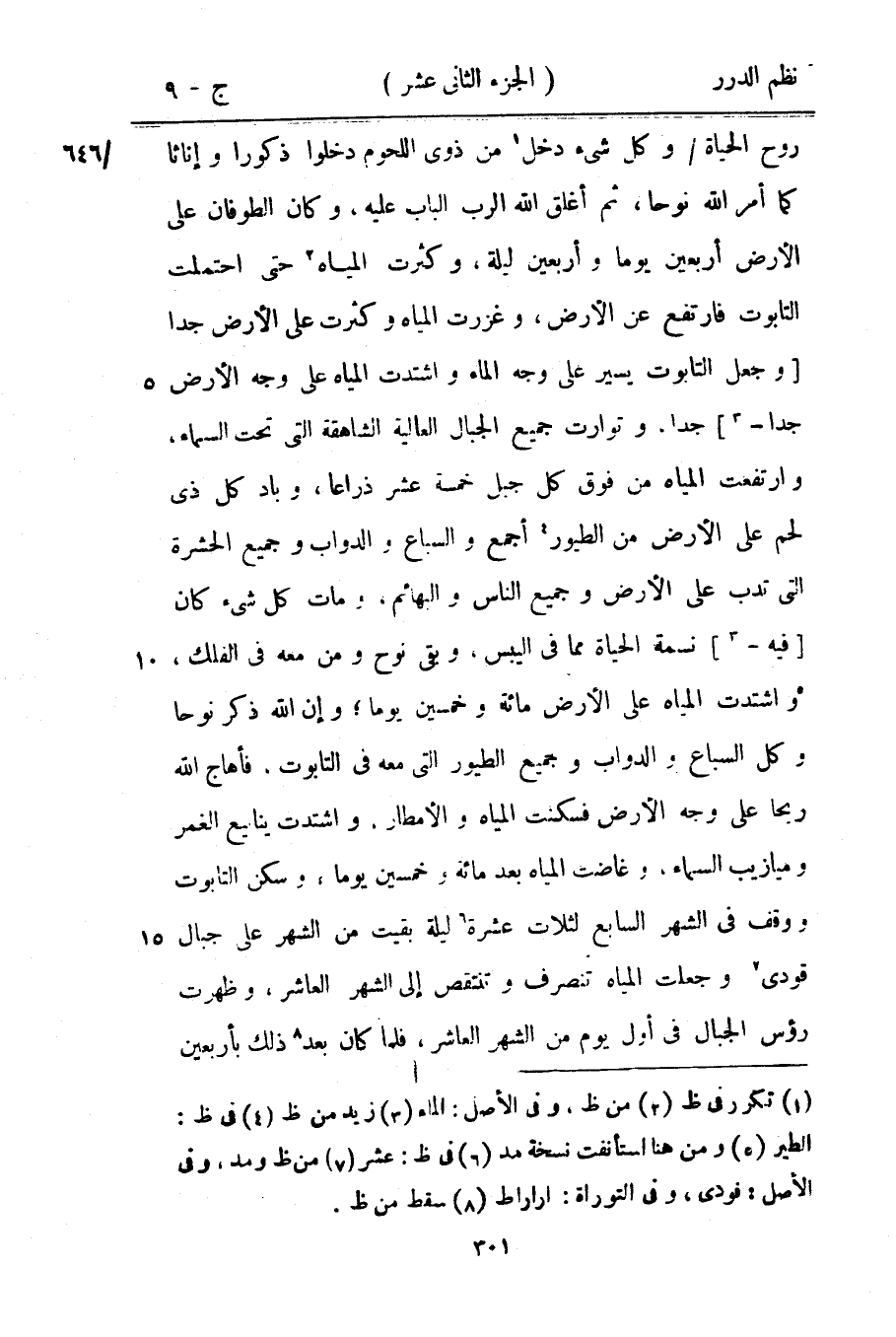 وتوارت جميع الجبال العالية الشاهقة التي تحت السماء، وارتفعت المياة من فوق كل جبل خمسة عشر ذراعاً، وباد كل ذي لحم على الأرض من الطيور أجمع والسباع والدواب وجميع الحشرة التي تدب على الأرض وجميع الناس والبهائم، ومات كل شيء كان فيه نسمة الحياة مما في اليبس. وبقي نوح ومن معه في الفلك، واشتدت المياه على الأرض مائة وخمسين يوماً؛ وإن الله ذكر نوحاً وكل السباع والدواب وجميع الطيور التي معه في التابوت. فأهاج الله ريحاً على وجه الأرض فسكنت المياه والأمطار. واشتدت ينابيع الغمر وميازيب وغاضت المياه بعد مائة وخمسين يوماً، وسكن التابوت ووقف في الشهر السابع لثلاث عشرة ليلة بقيت من الشهر على جبال قودي وجعلت المياه تنصرف وتنتقص إلى الشهر العاشر، وظهرت رؤوس الجبال في أول يوم الشهر العاشر، فلما كان بعد ذلك بأربعين