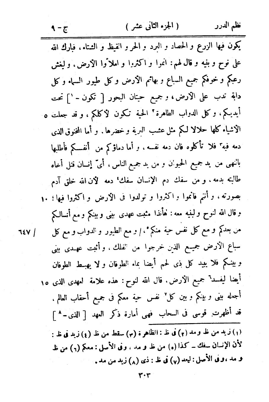 يكون فيها الزرع والحصاد والبرد والحر والقيظ والشتاء، فبارك الله على نوح وبنيه وقال لهم: انموا واكثروا واملؤوا الأرض، وليغش رعبكم وخوفكم جميع السباع وبهائم الأرض وكل طيور السماء وكل دابة تدب على الأرض، وجميع حيتان البحور تكون تحت أيديكم، وكل الدواب الطاهرة الحية تكون لأكلكم، وقد جعلت الأشياء كلها حلالاً لكم مثل عشب البرية خضرها، وأما المخنوق الذي دمه فيه فلا تأكلوه فإن دمع نفسه، وأما دماؤكم من أنفسكم فأطلبها بالنهي من يد جميع الحيوان ومن يد جميع الناس، أي إنسان قتل أخاه طالبته بدمه، ومن سفك دم الإنسان سفك دمه لأن الله خلق آدم بصورته، وأنتم فانموا واكثروا وولدوا في الأرض وأكثروا فيها؛ وقال الله لنوح ولبنيه معه: هأنذا مثبت عهدي بيني وبينكم ومع أنسالكم من بعدهم ومع كل نفس حية منكم، ومع الطيور والدواب ومع كل سباع الأرض جميع الذين خرجوا من الفلك.