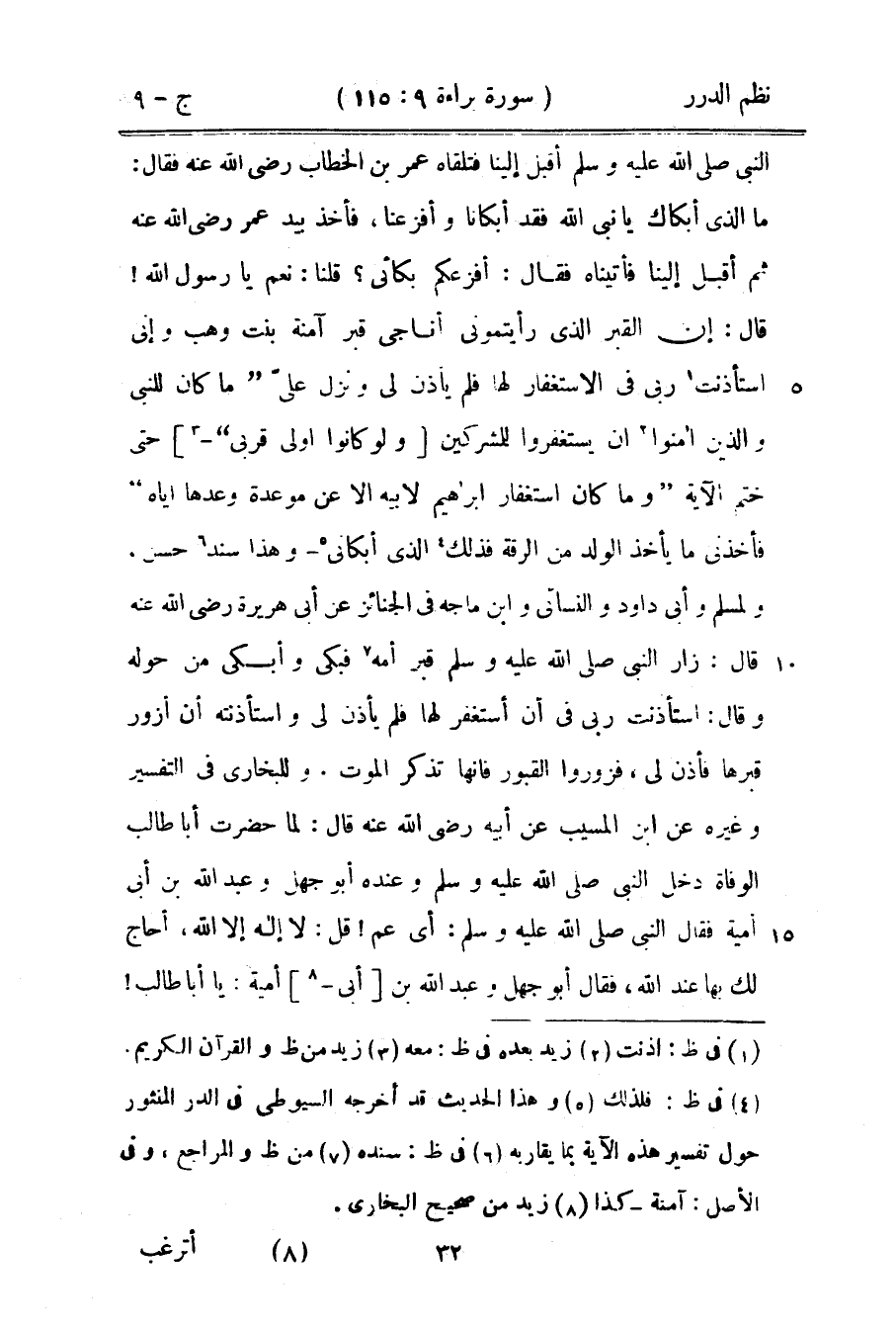 النبي صَلَّى اللهُ عَلَيْهِ وَسَلَّمَ أقبل إلينا فتلقاه عمر بن الخطاب رضي الله عنه فقال: ما الذي أبكاك يا نبي الله فقد فقد أبكانا وأفزعنا، فأخذ بيد عمر رضي الله عنه ثم أقبل إلينا فأتيناه فقال: أفزعكم بكائي؟ قلنا: نعم يا رسول الله! قال: إن القبر الذي رأيتموني أناجي قبر آمنة بنت وهب وإني استأذنت ربي في الاستغفار لها فلم ياذن لي ونزل عليّ {ما كان للنبي والذين آمنوا أن يستغفروا للمشركين ولو كانوا أولى قربى} حتى ختم الآية {وما كان استغفار إبراهيم لأبية إلا عن موعدة وعدها إياه} فأخذني ما يأخذ الولد من الرقة فذلك الذي أبكاني»
