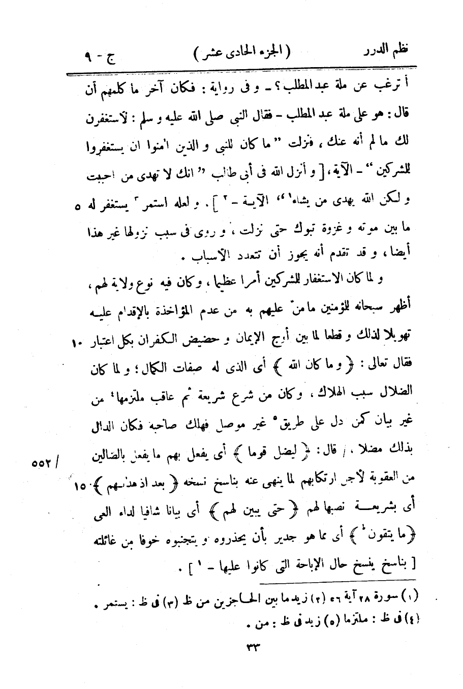 أترغب عن ملة عبد المطلب؟ - وفي رواية: فكان آخر ما كلمهم أن قال: هو على ملة عبد المطلب - فقال النبي صَلَّى اللهُ عَلَيْهِ وَسَلَّمَ: لأستغفرن لك ما لم أنه عنك، فنزلت {ما كان للنبي والذين آمنوا أن يستغفروا للمشركين} وأنزل الله في أبي طالب {إنك لا تهدي من أحببت ولكن الله يهدي من يشاء} [القصص: 56] » ولعله استمر يستغفر له ما بين موته وغزوة تبوك حتى نزلت، ورُوي في سبب نزولها غير هذا أيضاً، وقد تقدم أنه يجوز أن تتعدد الأسباب.