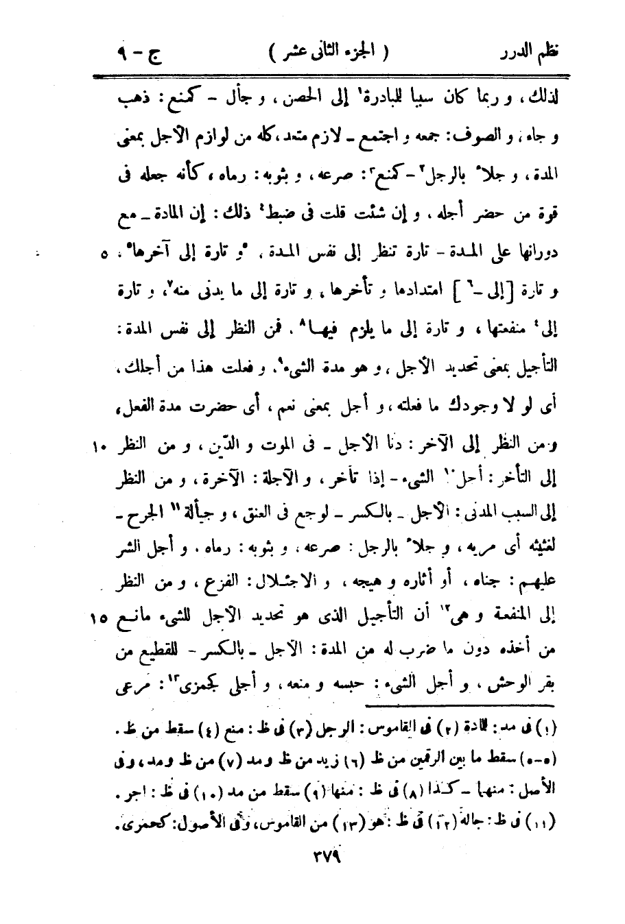 لذلك، وربما كان سبباً للمبادرة إلى الحصن، وجأل - كمنع: ذهب وجاء، والصوف: جمعه واجتمع - لازم متعد، كله من لوازم الأجل بمعنى المدة، وجلأ بالرجل - كمنع: صرعته، وبثوبه: رماه، كأنه جعله في قوة من حضر أجله، وإن شئت قلت في ضبط ذلك: إن المادة - مع دورانها على المدة - تارة تنظر إلى نفس المدة، وتارة إلى آخرها، وتارة إلى امتدادها وتأخرها، وتارة إلى ما يدني منه، وتارة إلى منفعتها، وتارة إلى ما يلزم فيها، فمن النظر إلى نفس المدة: التأجيل بمعنى تحديد الأجل، وهو مدة الشيء، وفعلت هذا من أجلك، أي لولا وجودك ما فعلته، وأجل بمعنى نعم، أي حضرت مدة الفعل، ومن النظر إلى الآخر: دنا الأجل - في الموت والدّين، ومن النظر إلى التأخر: أجل الشيء - إذا تأخر، والآجلة: الآخرة، ومن النظر إلى السبب المدني: الأجل - بالكسر - لوجع في العنق، وجيألة الجرح - لغثيثه أي مريه، وجلأ بالرجل: صرعه وبثوبه: رماه، وأجل الشر عليهم: جناه، أو أثاره وهيجه، والاجئلال: الفزع، ومن النظر إلى المنفعة وهي أن التأجيل الذي هو تحديد الأجل للشيء مانع من أخذه دون ما ضرب له من المدة: الاجل - بالكسر - للقطيع من بقر الوحش، وأجل الشيء: حبسه ومنعه، وأجلى كجمزي: مرعي