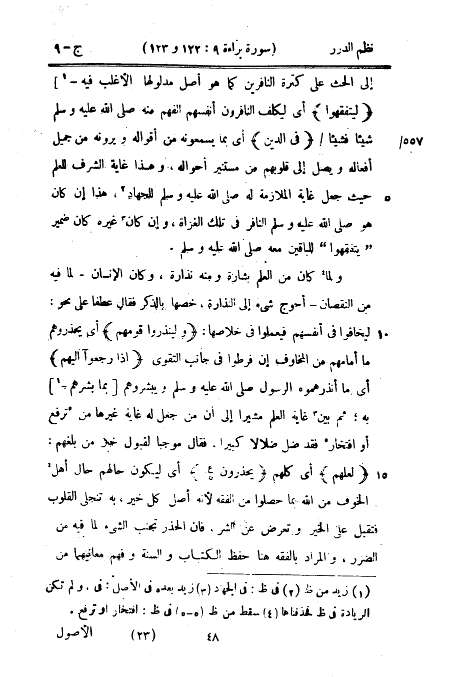 ولما كان من العلم بشارة ومنه نذارة، وكان الإنسان - لما فيه من النقصان - أحوج شيء إلى النذارة، خصها بالذكر فقال عطفاً على نحو: ليخافوا في أنفسهم فيعملوا في خلاصها: {ولينذروا قومهم} أي يحذروهم ما أمامهم من المخاوف إن فرطوا في جانب التقوى {إذا رجعوا إليهم} أي ما أنذرهموه الرسول صَلَّى اللهُ عَلَيْهِ وَسَلَّمَ ويبشروهم بما بشرهم به؛ ثم بين غاية العلم مشيراً إلى أن من جعل له غاية غيرها من ترفع أو افتخار فقد ضل ضلالاً كبيراً، فقال موجباً لقبول خبر من بلغهم: {لعلهم} أي كلهم {يحذرون*} أي ليكون حالهم حال أهل الخوف من الله بما حصلوا من الفقه لأنه أصل كل خير، به تنجلي القلوب فَتقبل على الخير وتعرض عن الشر، فإن الحذر تجنب الشيء لما فيه من الضرر، والمراد بالفقه هنا حفظ الكتاب والسنة وفهم معانيهما