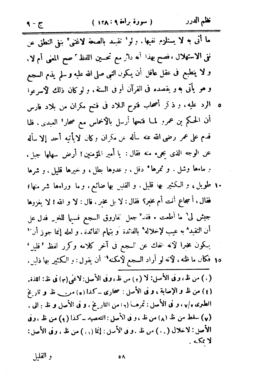 فقد جعل الفاروق السجع قسيماً للخير فدل على أن التقيد به عيب لإخلاله بالفائدة أو بتمام الفائدة، ولعله إنما جوز أن يكون مخبراً لنه انفك عن السجع في آخر كلامه وكرر لفظ «قليل» فكان ما ظنه، لأنه لو أراد السجع لأمكنه أن يقول والكثير بها ذليل،