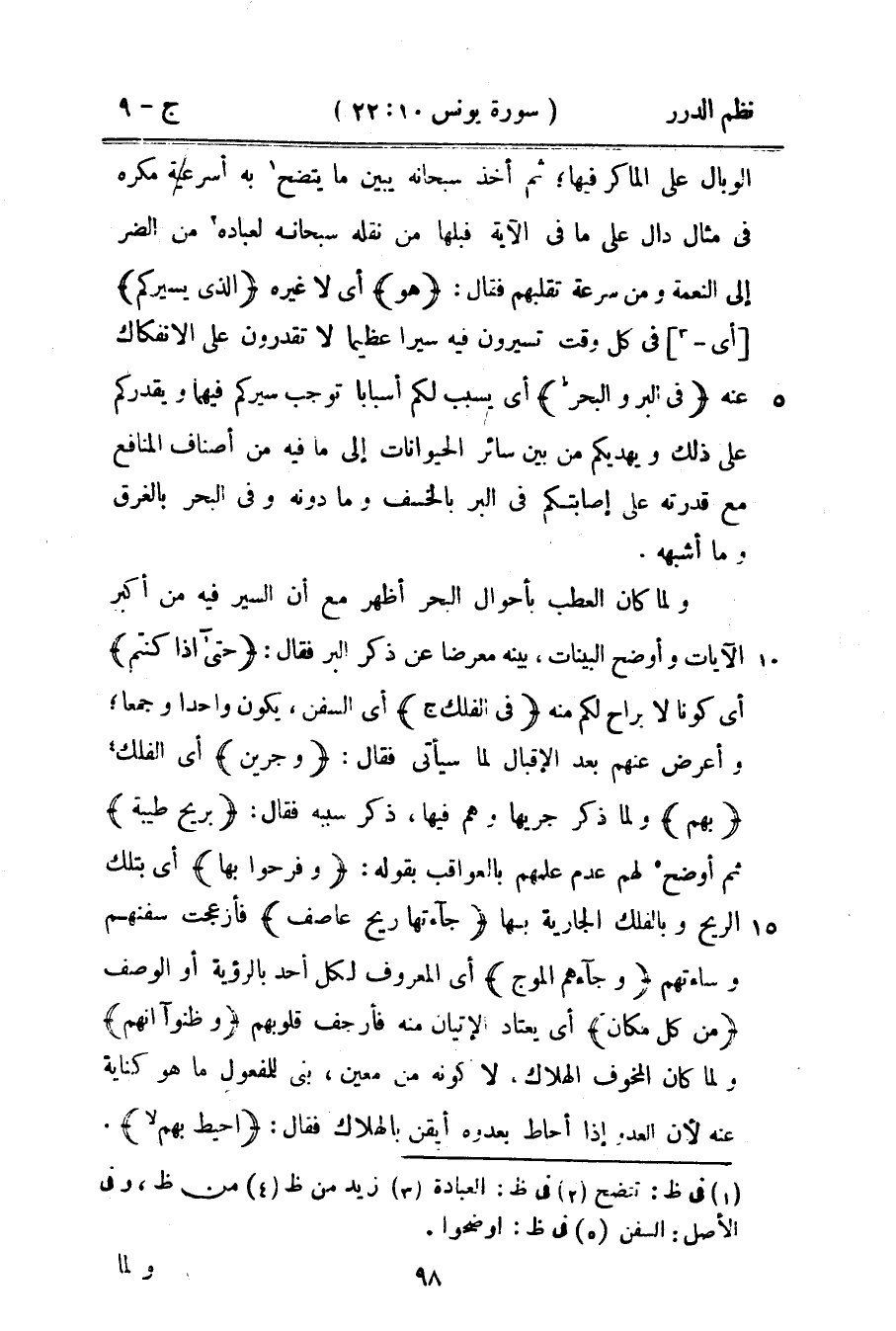 ولما كان العطب بأحوال البحر أظهر مع أن السير فيه من أكبر الآيات وأوضح البينات، بينه معرضاً عن ذكر البر فقال: {حتى إذا كنتم} أي كوناً لا براح لكم منه {في الفلك} أي السفن، يكون واحداً وجمعاً؛ وأعرض عنهم بعد الإقبال لما سيأتي فقال: {وجرين} أي الفلك؛ {بهم} ولما ذكر جريها وهم فيها، ذكر سببه فقال: {بريح طيبة} ثم أوضح لهم عدم علمهم بالعواقب بقوله: {وفرحوا بها} أي بتلك الريح وبالفلك الجارية بها {جاءتها ريح عاصف} فأزعجت سفنهم وساءتهم {وجاءهم الموج} أي المعروف لكل أحد بالرؤية أو الوصف {من كل مكان} أي يعتاد الإتيان منه فأرجف قلوبهم {وظنوا أنهم} ولما كان المخوف الهلاك، لا كونه من معين، بني للمفعول ما هو كناية عنه لأن العدو إذا أحاط بعدوه أيقن بالهلاك فقال: {أحيط بهم} .