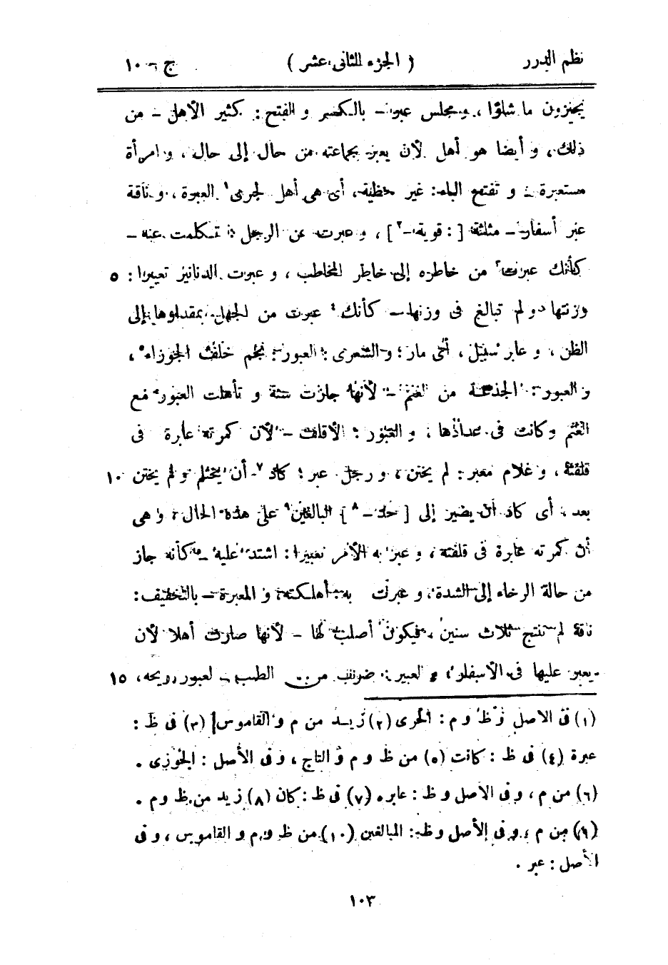 يجيزون ما شاؤوا، ومجلس عبر - بالكسر والفتح: كثير الأهل - من ذلك، وأيضاً هو أهل لأن يعبر بجماعته من حال إلى حال، وبامرأة مستعبرة - وتفتح الباء: غير محظية، أي هي أهل لجري العبرة، وناقة عبر أسفار - مثلثة قوية، وعبرت عن الرجل فتكلمت عنه - كأنك عبرت من خاطره إلى خاطر المخاطب، وعبرت الدنانير تعبيراً: وزنتها ولم تبالغ في وزنها - كأنك عبرت من الجهل بمقدارها إلى الظن، أو عابر سبيل، أحي مار؛ والشعري: العبور: نجم خلف الجوزاء، والعبور: الجذعة من الغنم - لأنها جازت سنة وتأهلت العبور مع الغنم وكانت في عدادها، والعبور: لأقلف - لأن كمرته عابرة في قلفته، وغلام معبر: لم يختن، ورجل عبر: كاد أن يحتلم ولم يختن بعد، أي كاد أن يصير إلى خذ البالغين على هذه الحال، وهي أن كمرته عابرة في قلفته، وعبر به الأمر تعبيراً: اشتد عليه - كأنه جاز من حالة الرخاء إلى الشدة وعبرت به أهلكته، والمعبرة - بالتخفيف: ناقة لم تنتج ثلاث سنين، فيكون أصلب لها - لأنها صارت أهلاً لأن يعبر عليها في الأسفار، والعبير ضرب من الطيب - لعبور ريحه،