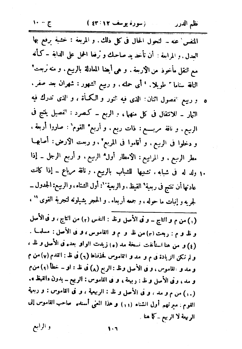 المنفس عنه - لتحول الحال في كل ذلك، والمربعة: خشبة يرفع بها العدل، والمرابعة: أن تأخذ يد صاحبك وترفعا الحمل على الدابة - كأنه مع النقل مأخوذ من الأربعة، وهي أيضاً المعادلة بالربيع، ومنه تربعت الناقة سناماً طويلاً، أي حملته، وربيع الشهور: شهران بعد صفر، وربيع الفصول اثنان الذي فيه النور والكمأة، والذي تدرك فيه الثمار - للانتقال في كل منهما، والربع - كصرد: الفصيل ينتج في الربيع، وناقة مربع: ذات ربع، وأربع القوم: صاروا أربعة، ودخلوا في الربيع، وأقاموا في المربع، وربعت الأرض: أصابها مطر الربيع، والمرابيع: الأمطار أول الربيع، وأربع الرجل - إذا ولد له في شبابه، تشبيهاً للشباب بالربيع، وناقة مرباع - إذا كانت عادتها أن تنتج في ربعية القيظ، والربعية: أول الشتاء، والربيع: الجدول - لجريه وإنبات ما حوله، وجمعه أربعاء، والحجر يشيلونه لتجربة القوى،